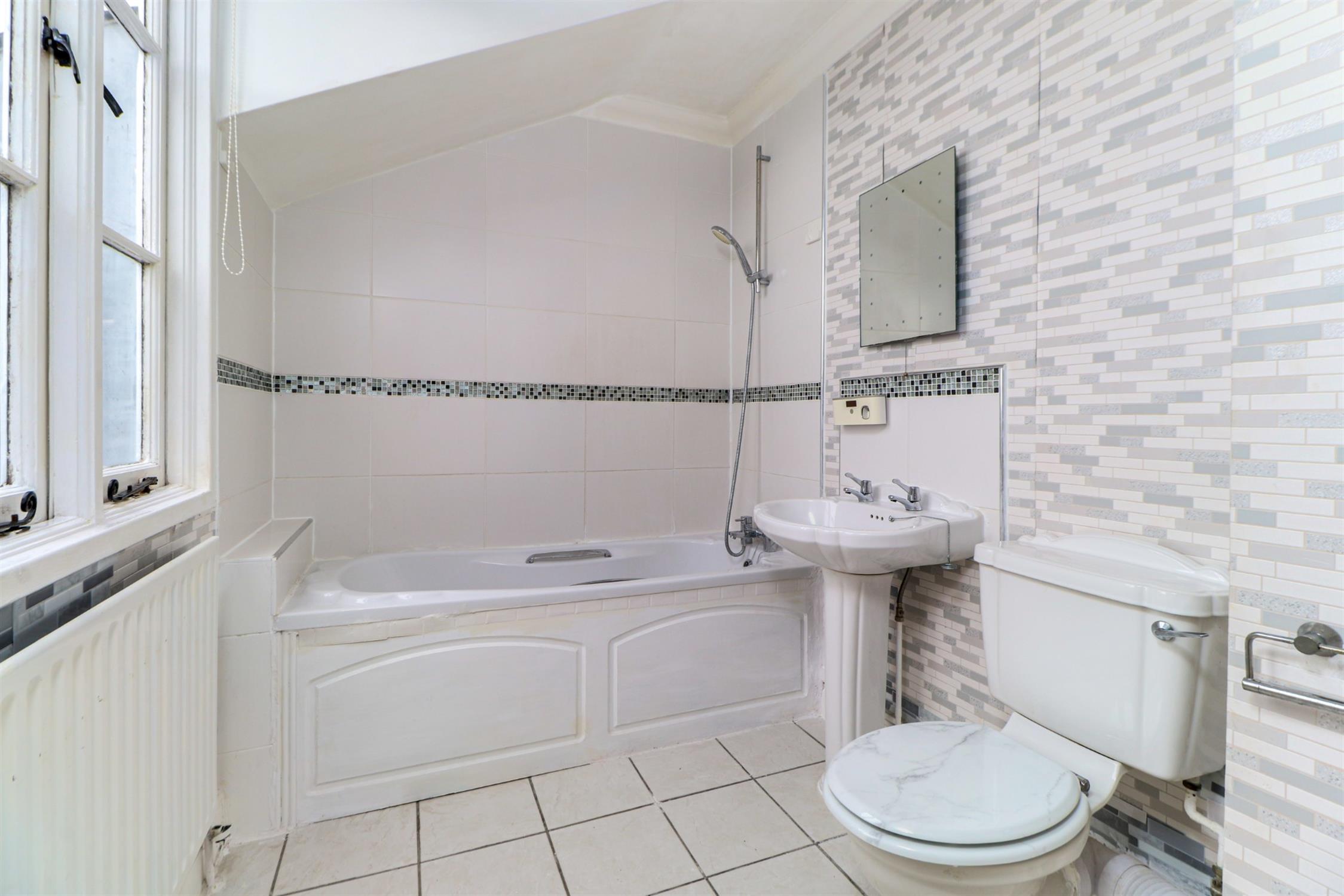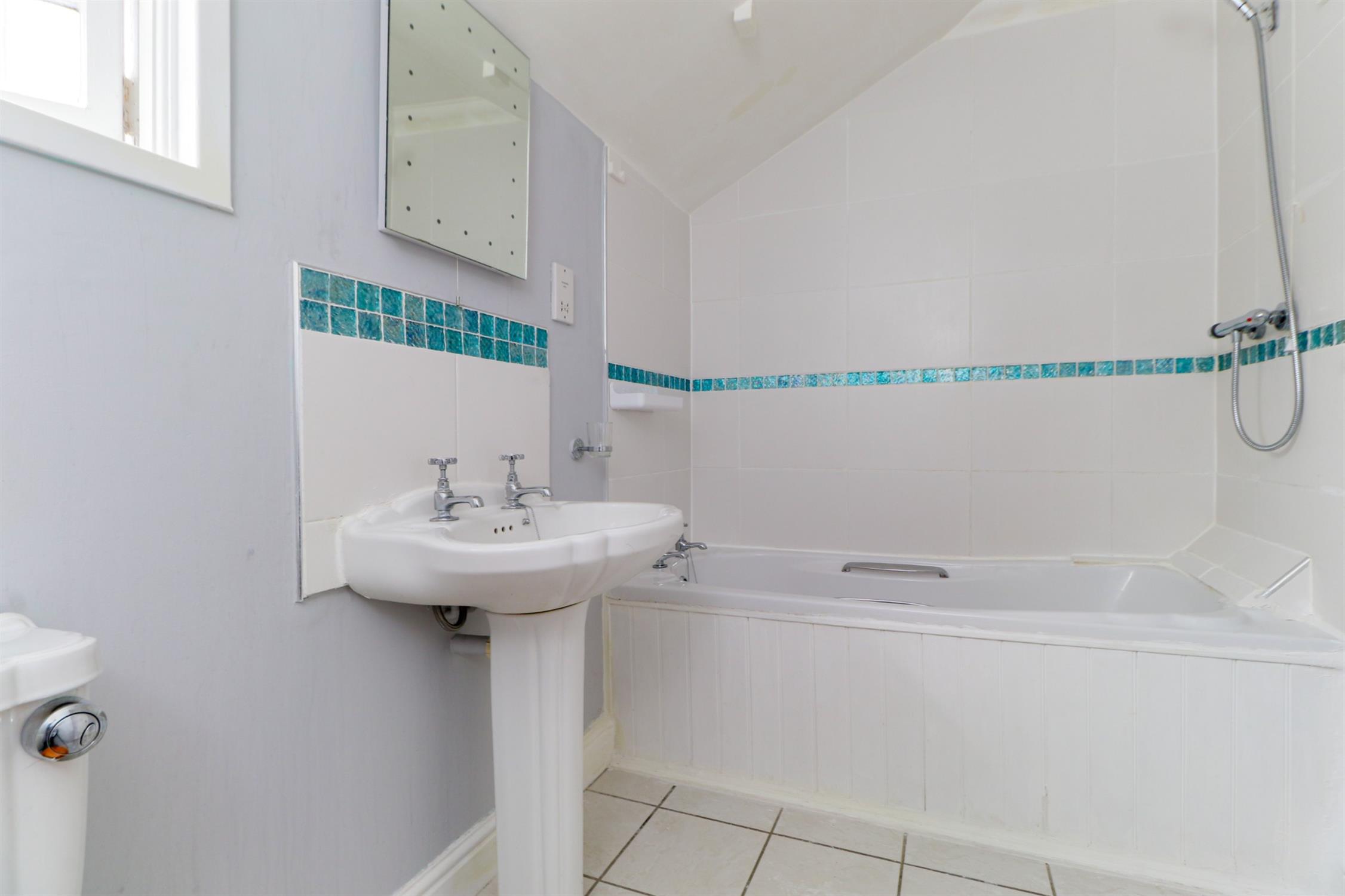 Smooth ceiling, window, WC, pedestal wash hand basin, bath with shower over, WC, part tiled walls, tiled floor.
