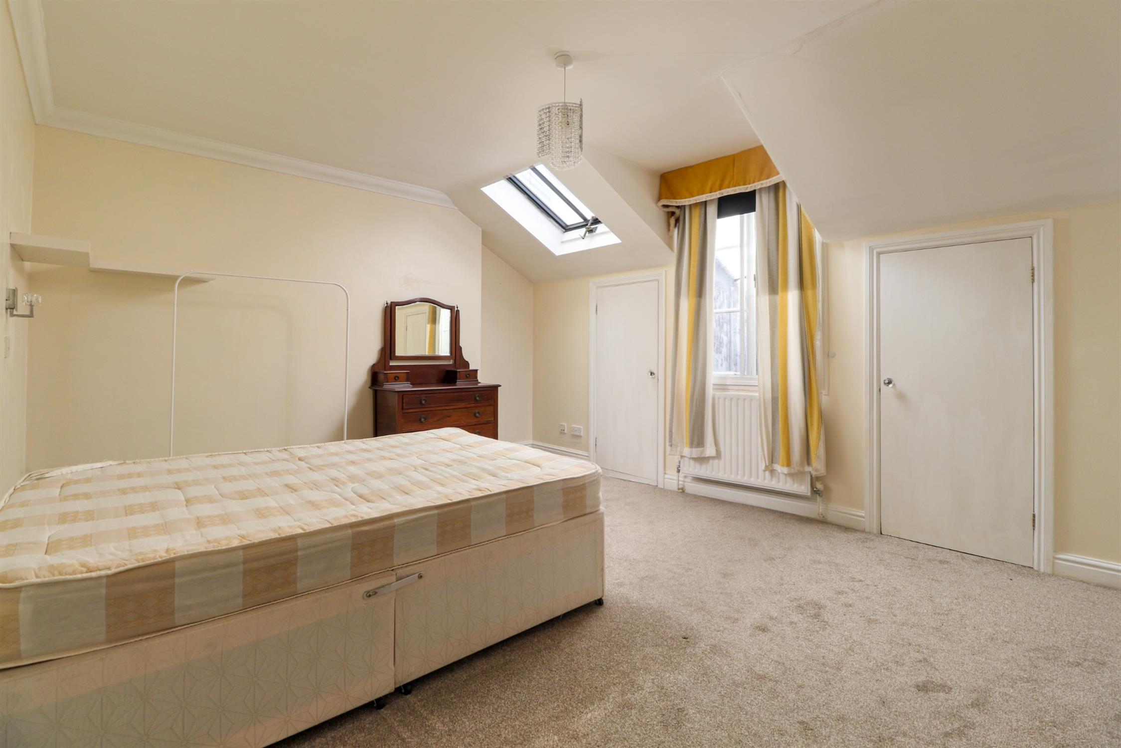 Smooth ceiling, window, double glazed roof window, two eaves storage cupboards, radiator, fitted carpet.