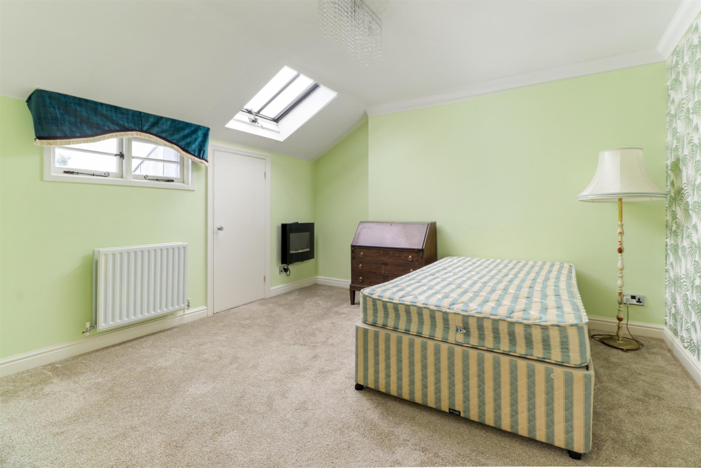 Smooth ceiling, window, double glazed roof window, eaves storage cupboard, radiator, wall mounted electric fire, fitted carpet.