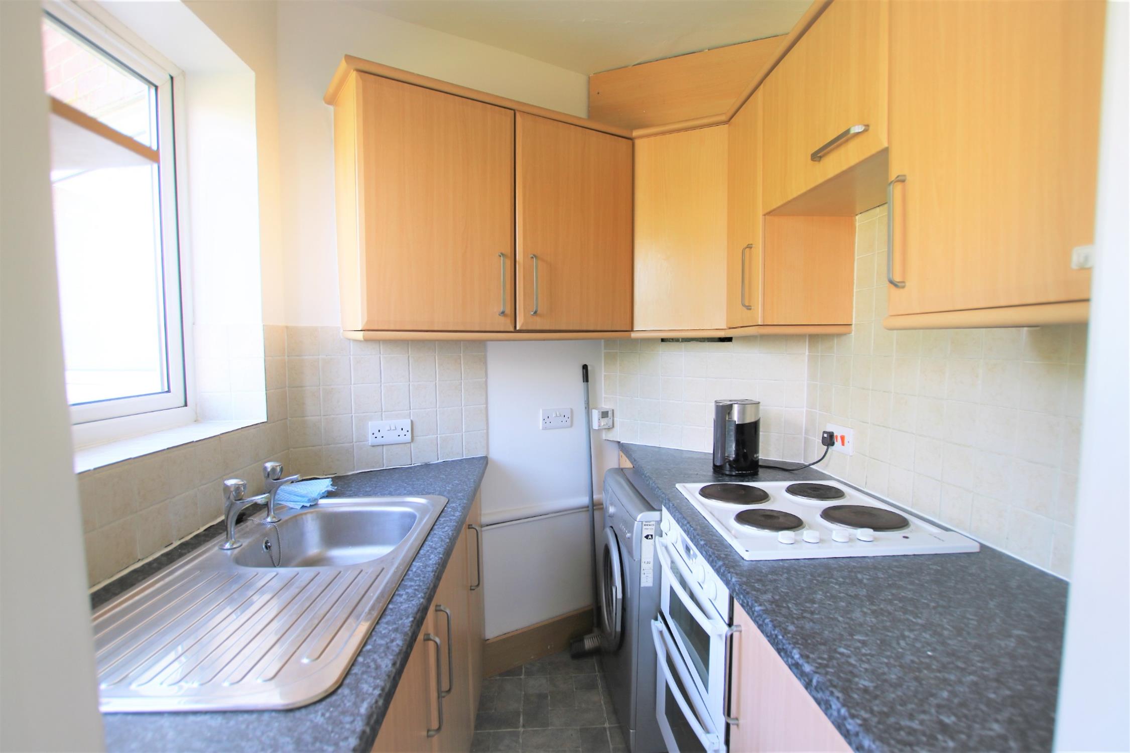 Double-glazed window overlooking the communal grounds, range of base and eye level units, stainless steel sink unit, built in electric oven and hob, partly tiled walls. Power points.