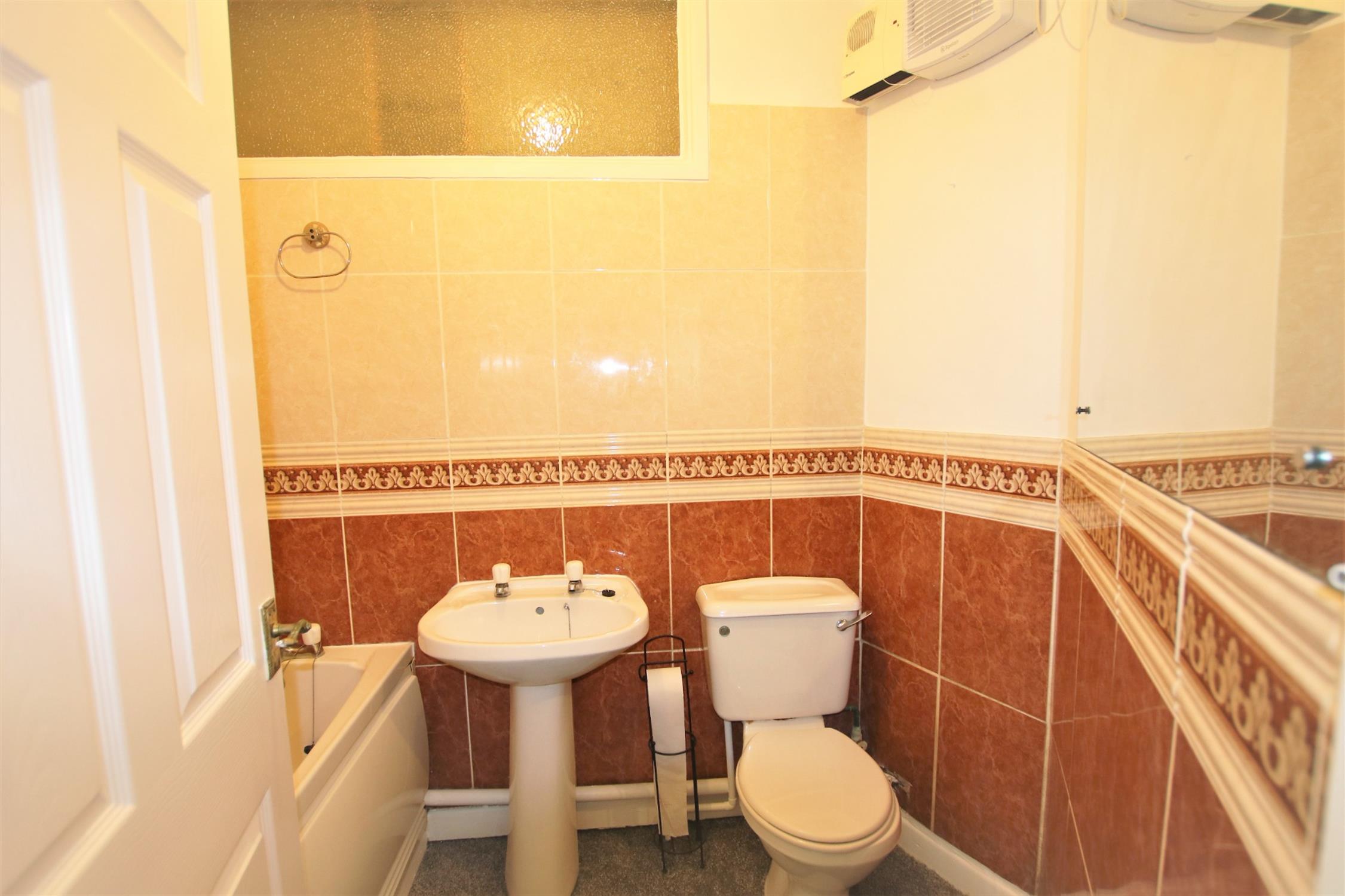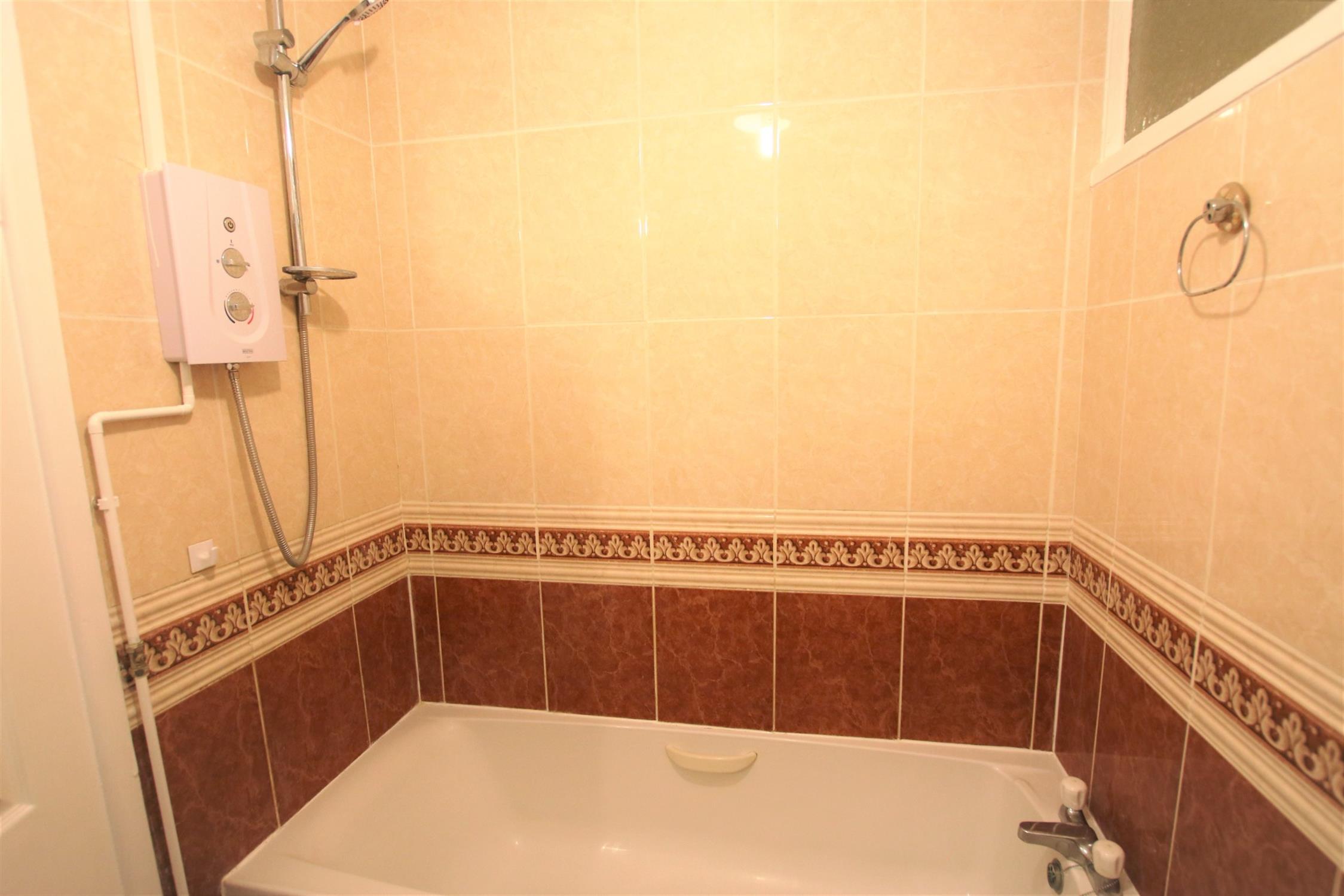 Fully tiled walls, wash hand basin, low level WC, panel enclosed bath with electric shower over, extractor fan.