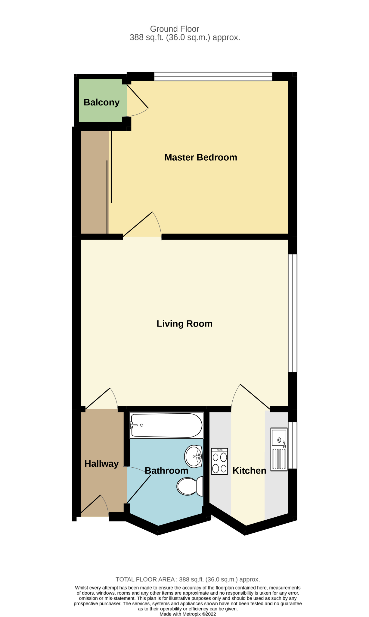Large double-glazed picture window overlooking the communal grounds. Doors to the bedroom and kitchen. Power and TV points, electric storage heater.
