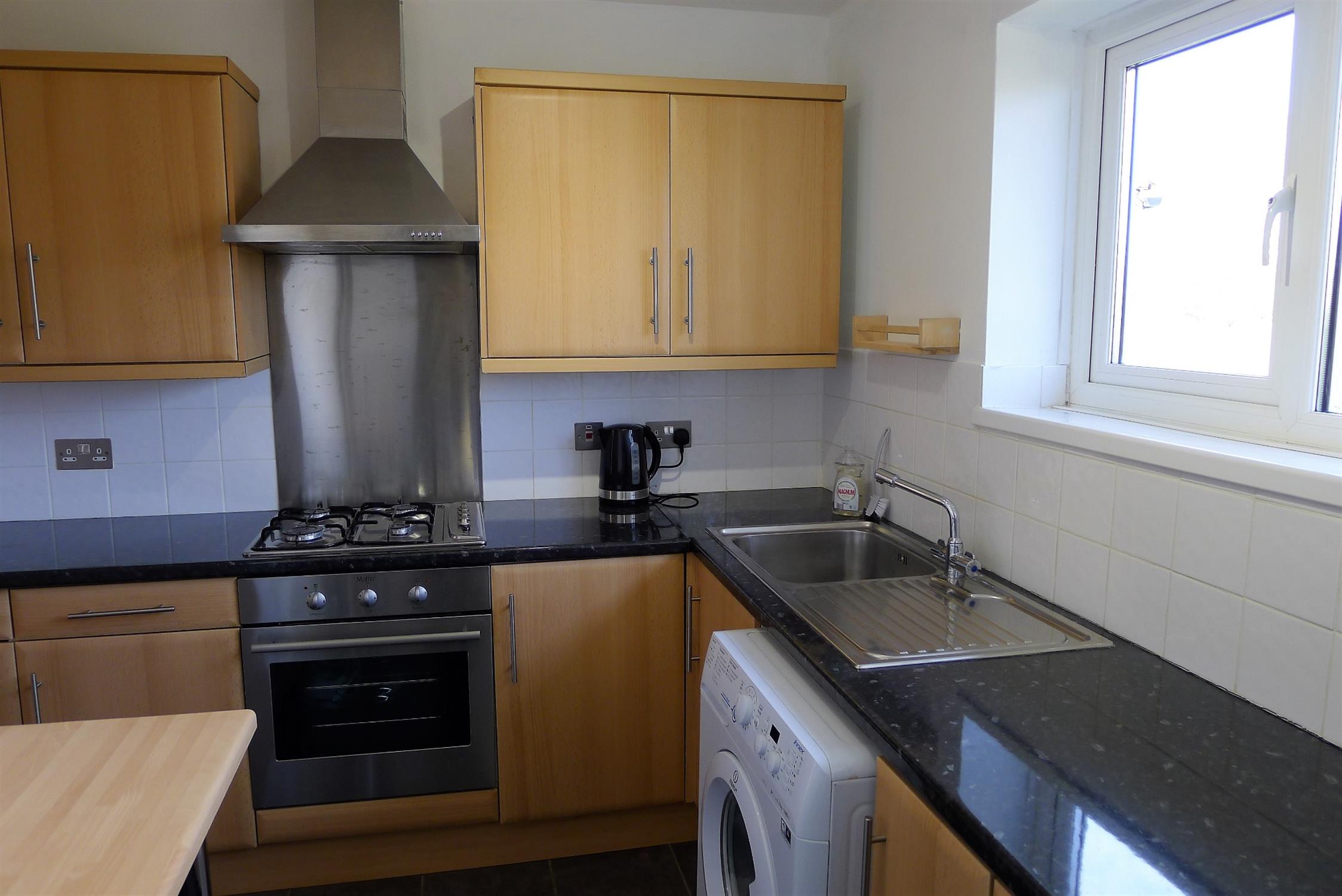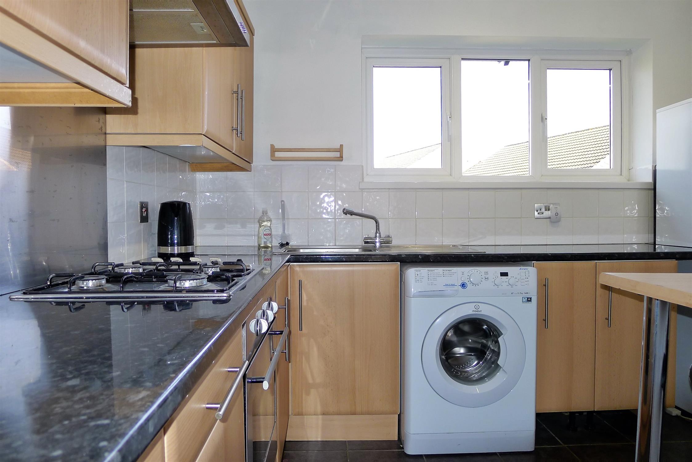 Double glazed window to rear elevation. Kitchen comprising; stainless steel single drainer sink unit with cupboard under. Further range of wall and base level units with roll edge work surfaces over and splashback tiling. Built-in four ring gas hob with cooker hood over and electric oven beneath. Plumbing for washing machine. Recess for fridge/freezer. Breakfast bar. Wall mounted gas boiler.