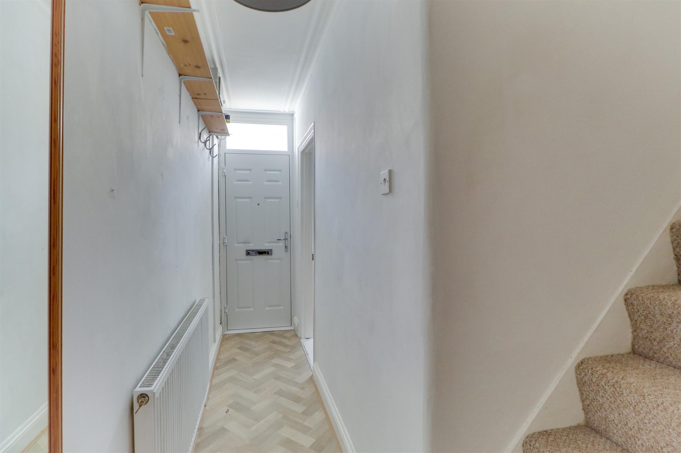 Smooth ceiling, ornate cornicing, shelving, coat hooks, stairs rising to first floor landing, radiator and vinyl flooring.