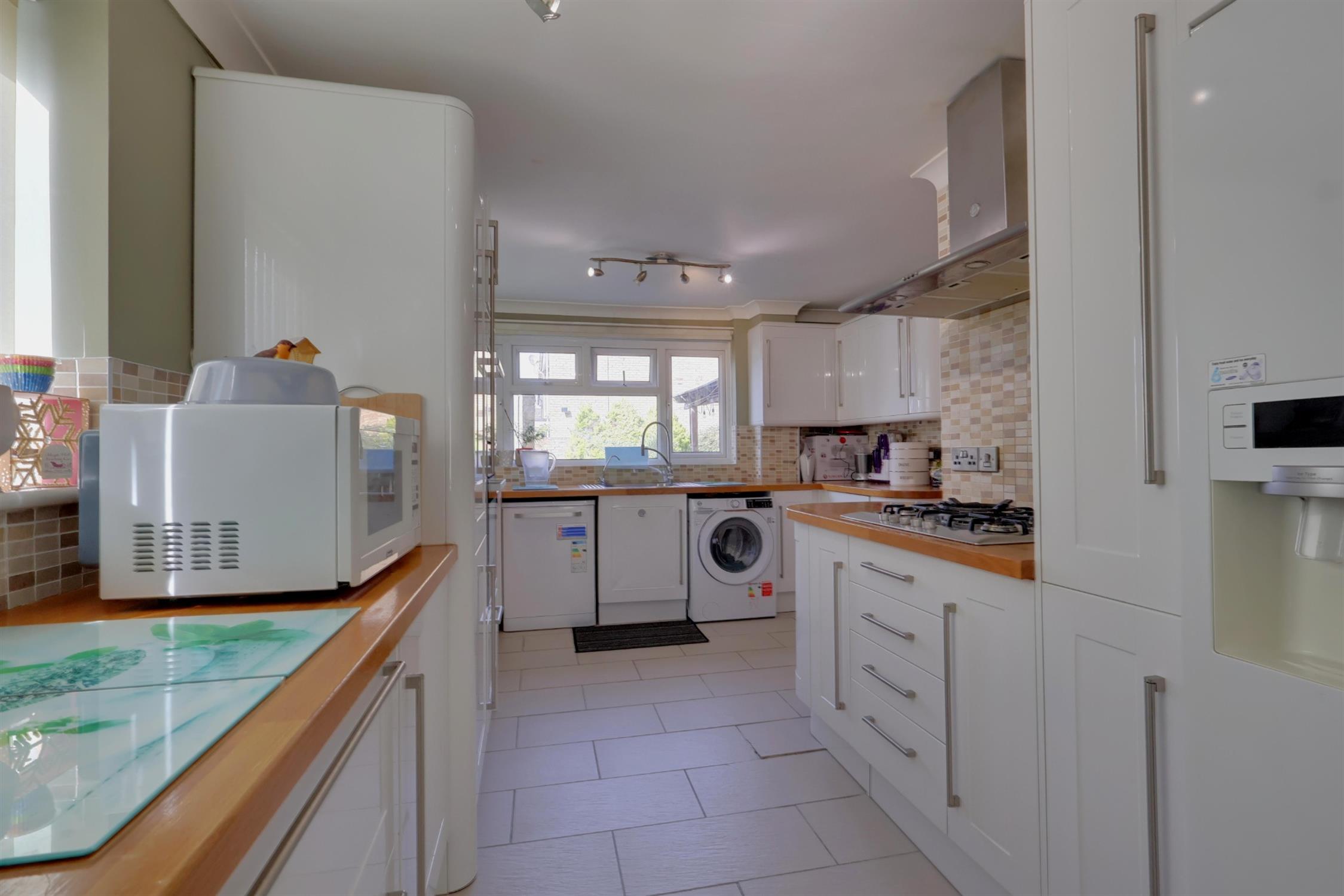 Windows to the front, side, and rear elevations. Fitted with a range of wall and base units with roll-top work surfaces. Stainless steel sink with mixer tap. Double eye-level ovens, integrated five-ring gas hob with extractor over. Space for fridge, freezer, dishwasher, washing machine, and tumble dryer. Part tiled walls, tiled floor, and vertical radiator.