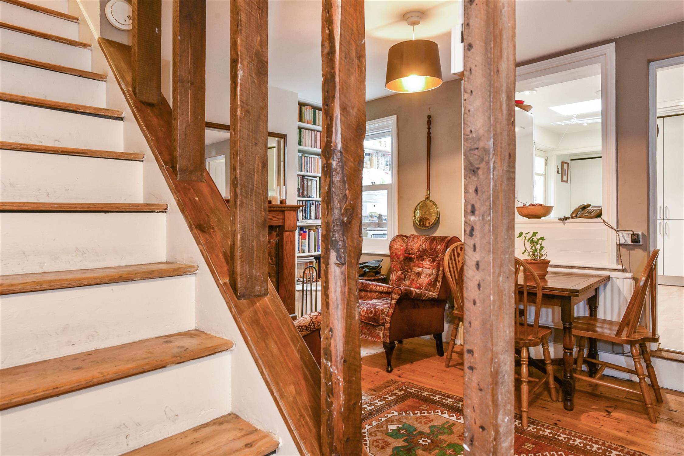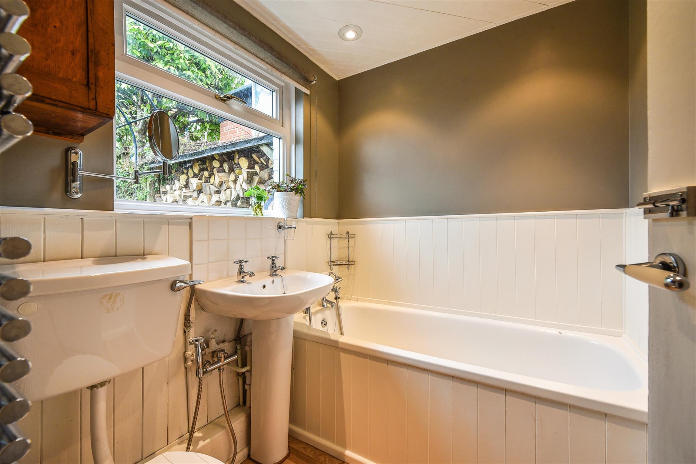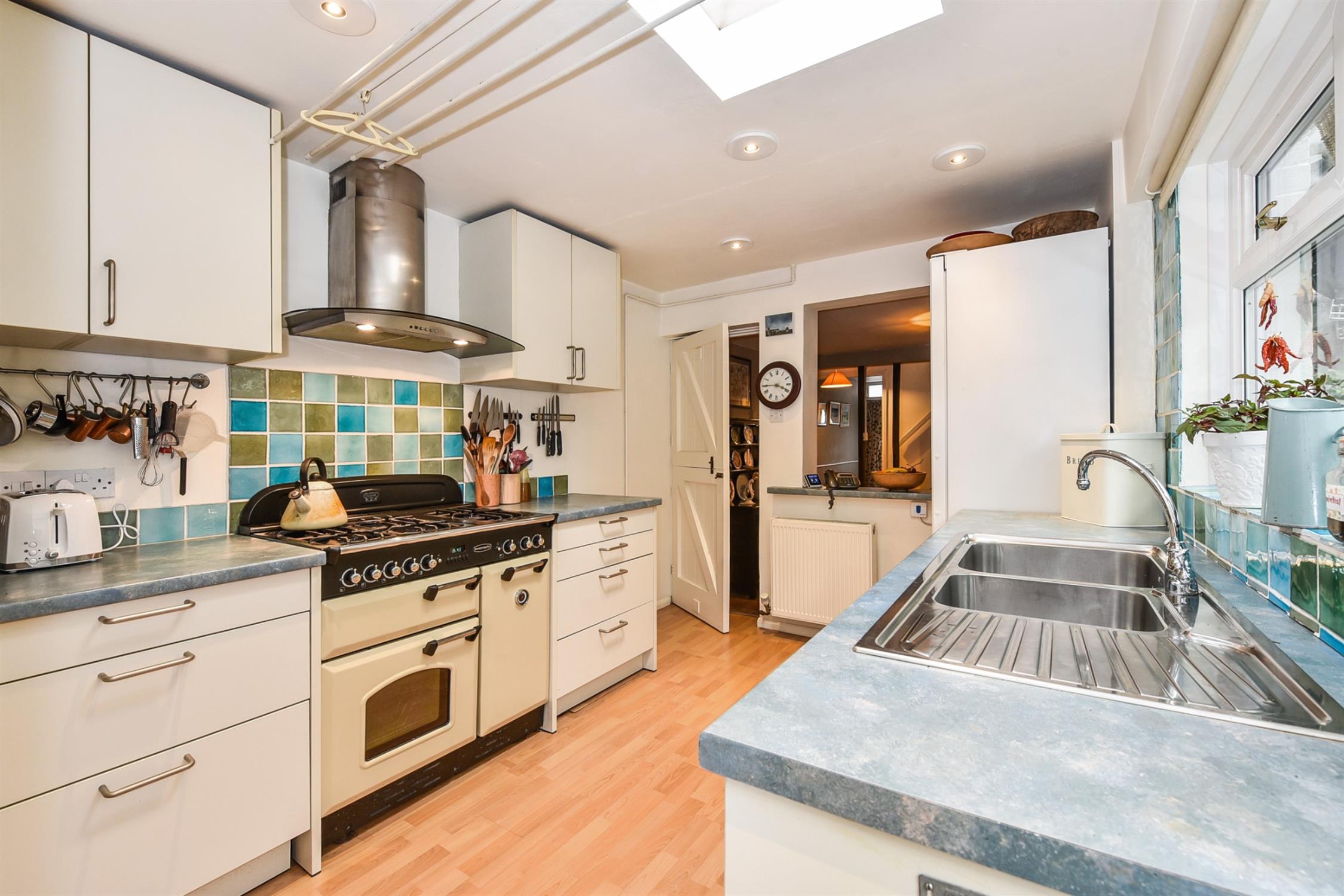 The second reception room is a dining room/drawing room and has a welcoming cottage feel. The vendor has wingback chairs facing the woodburner, very much giving the room the feel of a cosy nook in a traditional country inn. Stairs rise to the first floor, with vertical oak beams alongside. The contemporary kitchen continues the cosy feel, with a Rangemaster and ample storage. A skylight lets light in, as do the windows to the side into the storage/boot room. The bathroom is beyond the kitchen and adjacent to an airing cupboard.