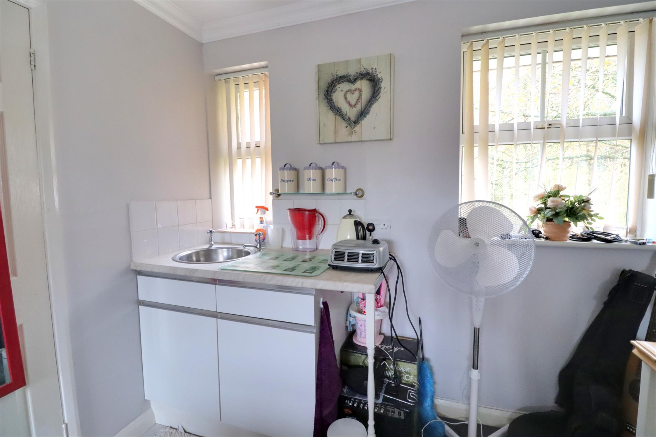 Front aspect double glazed window, side aspect double glazed window, two rear aspect double glazed windows, base units with inset circular sink, radiator, built in storage cupboard (previously a further wc and sink with plumbing still in situ to be converted back if required, for extended family accommodation), stairs down giving access to the garage and door leading to the front of the property.