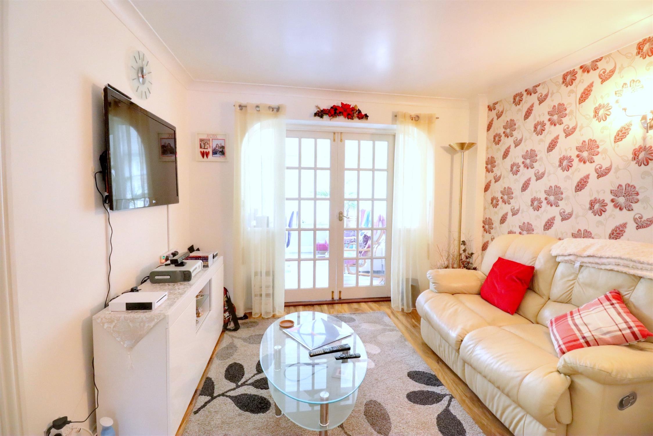 Laminate flooring, skirting radiator, door to the kitchen/breakfast room, French doors leading to the conservatory.