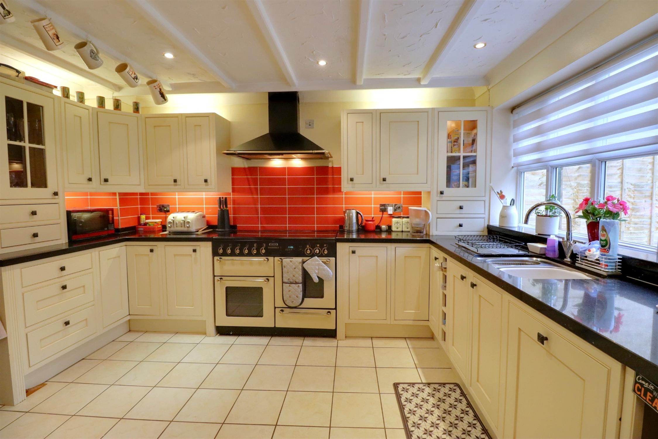 Fitted with a comprehensive range of wall and base units with granite work surfaces over, gas range cooker to remain with extractor hood over, integral dishwasher, space for fridge/freezer, inset one and half bowl stainless steel sink and drainer, radiator, rear aspect double glazed window, door to the utility room, open aspect to the conservatory.