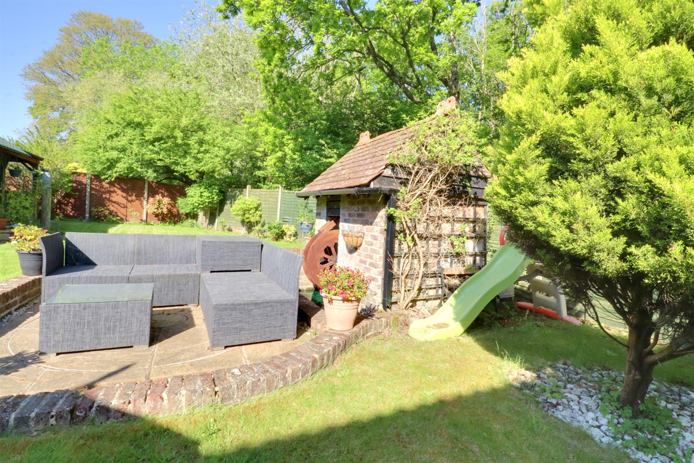 A well proportioned and private space with woods to the side, enclosed by fence, lawn and patio areas, mature shrubs and borders, outside tap, undercover seating/entertaining area with hot tub, brick built remote controlled water wheel feature.