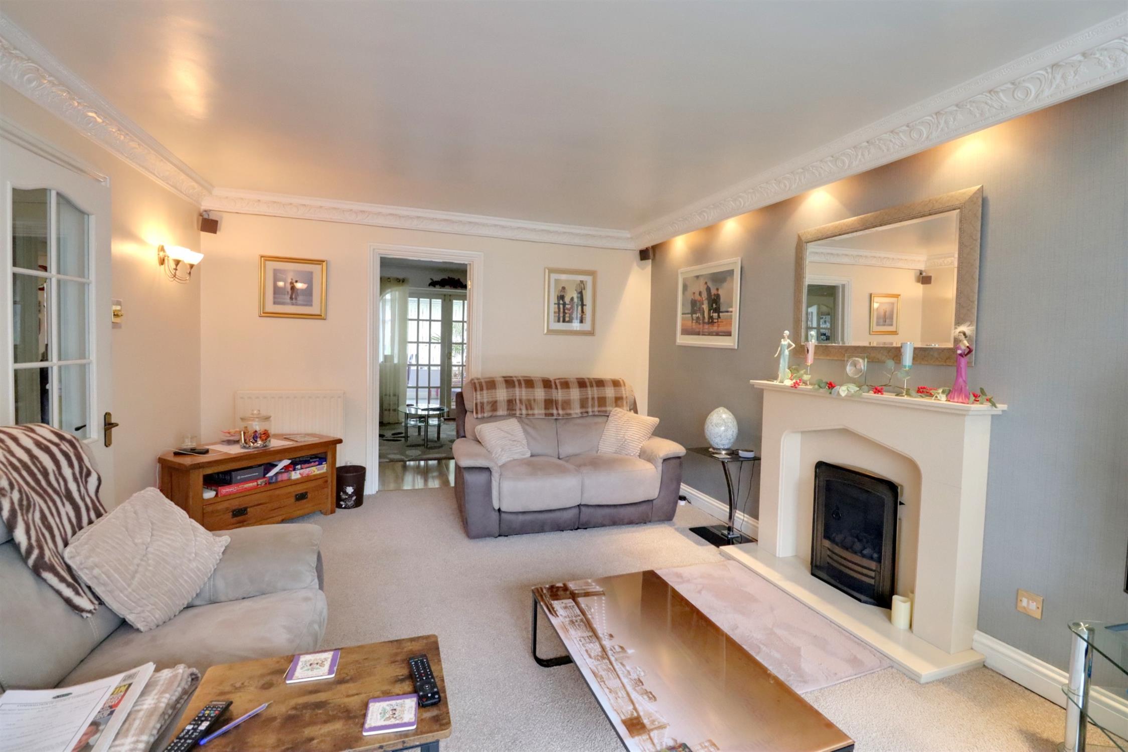 Front aspect double glazed bay window, two radiators, gas fire with marble surround, ornate coving with concealed lighting, door to the dining room.