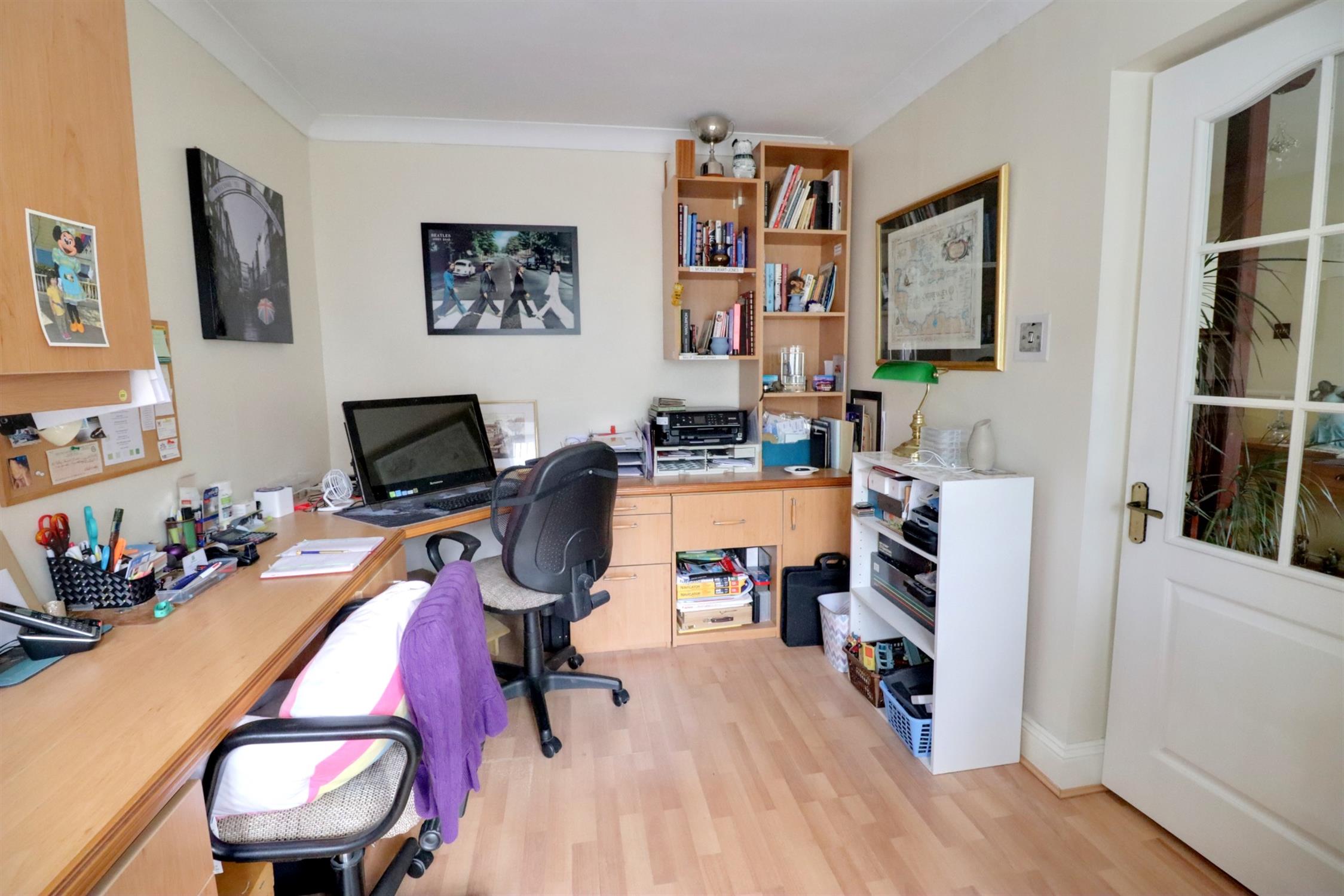 Accessed from a separate door to the front with the stairs leading to bedroom5/studio room and a side door leading to the garage. A larger than average garage measuring approximately 23’x9’, light and power, up and over door, rear aspect window and door leading to the rear garden.