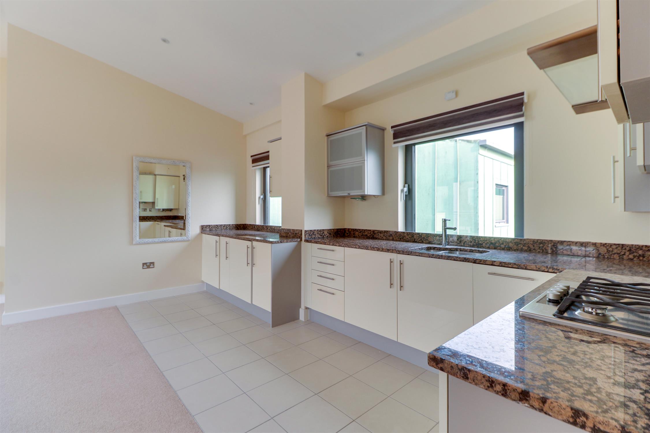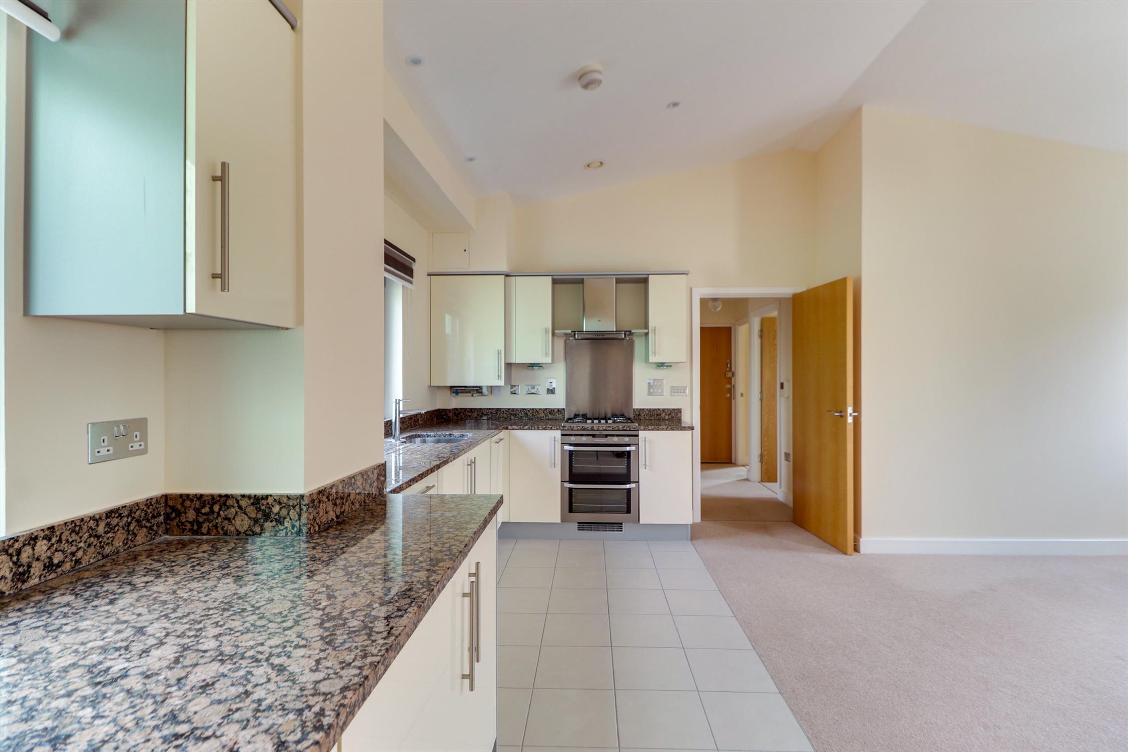Smooth ceiling, inset spotlights, double-glazed window and door to balcony, cupboard housing boiler, radiators, a range of wall and base mounted units with roll top work surfaces over, inset sink and drainer, gas hob and oven with extractor fan over, integrated fridge, freezer, dishwasher and washing machine. Part tiled flooring and part fitted carpet.