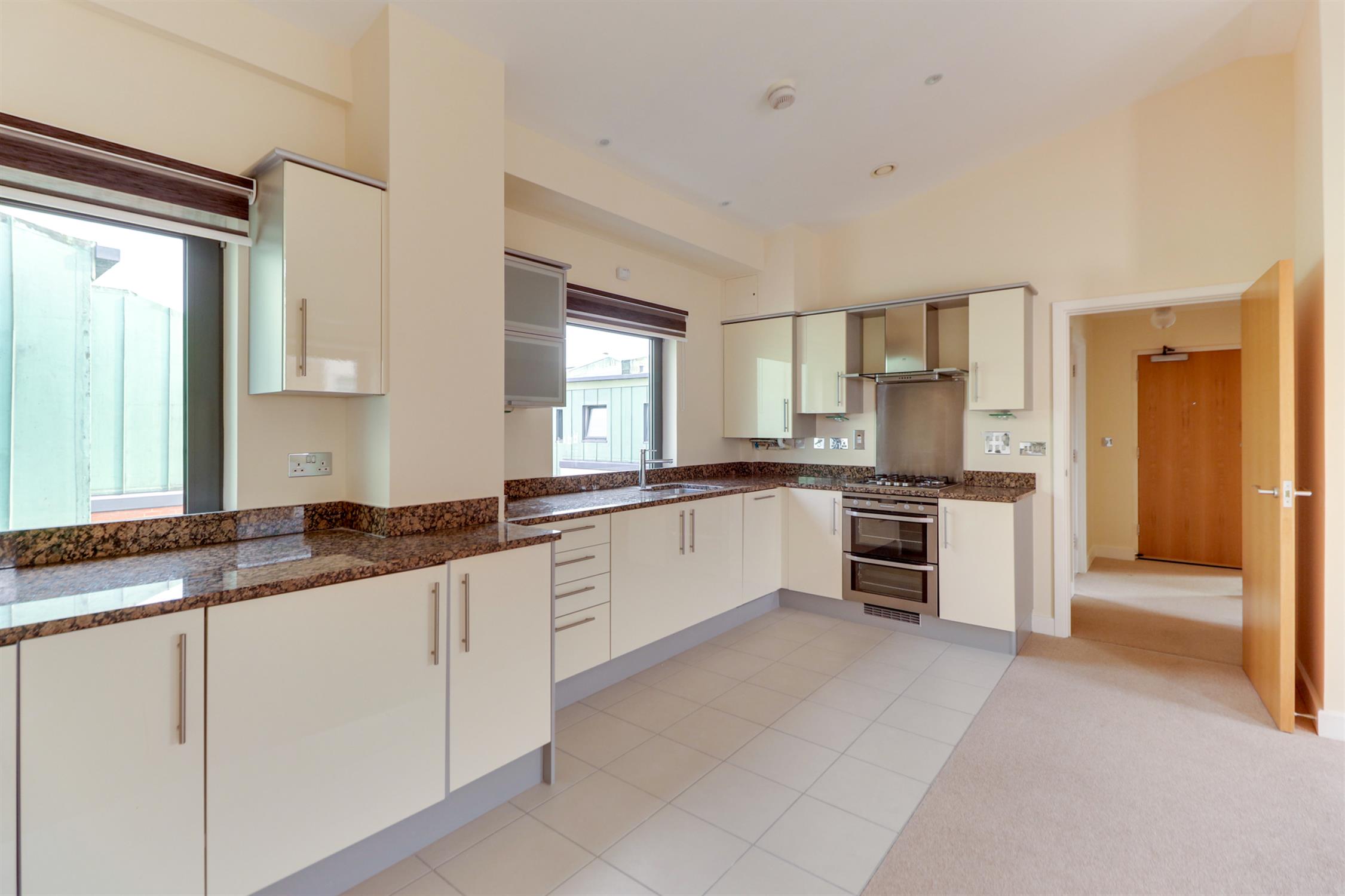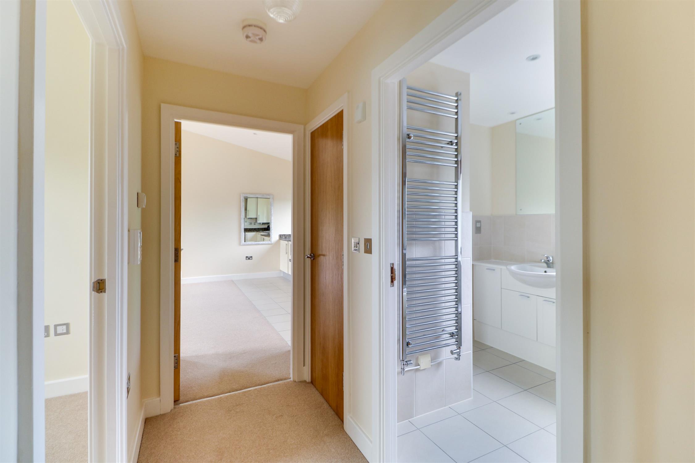 Smooth ceiling, inset spotlights, intercom entry system, thermostat, storage cupboard and doors into;