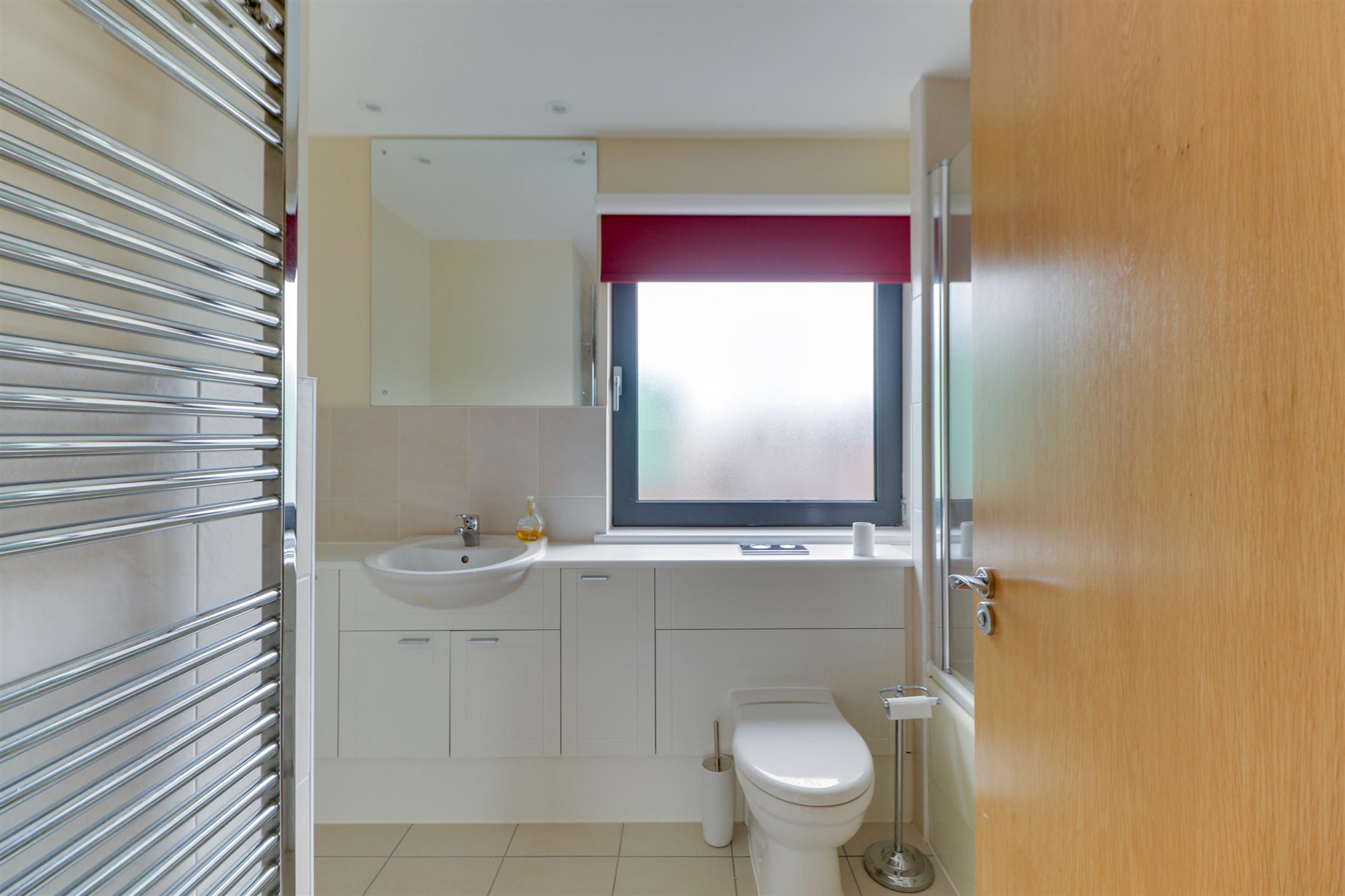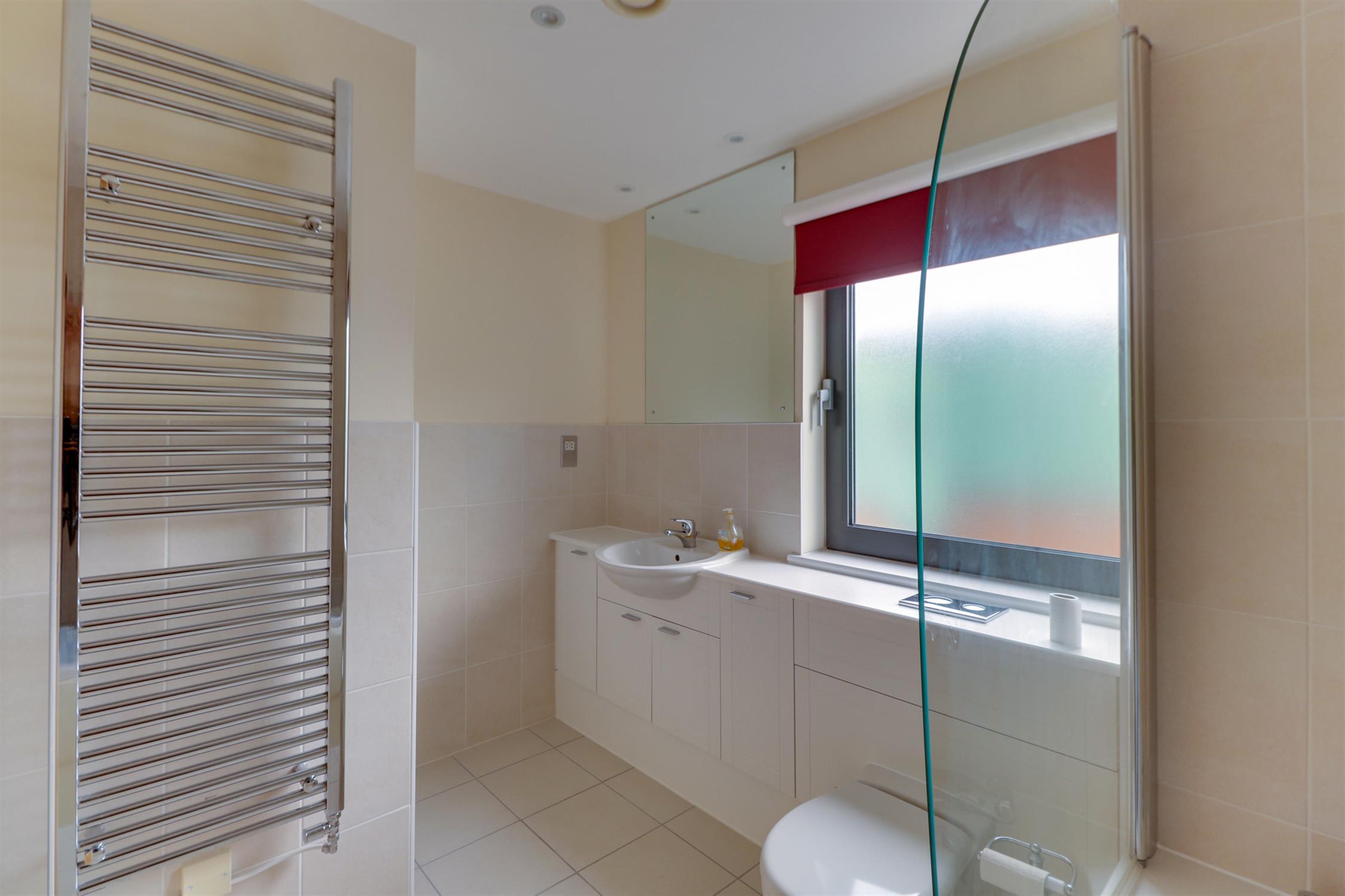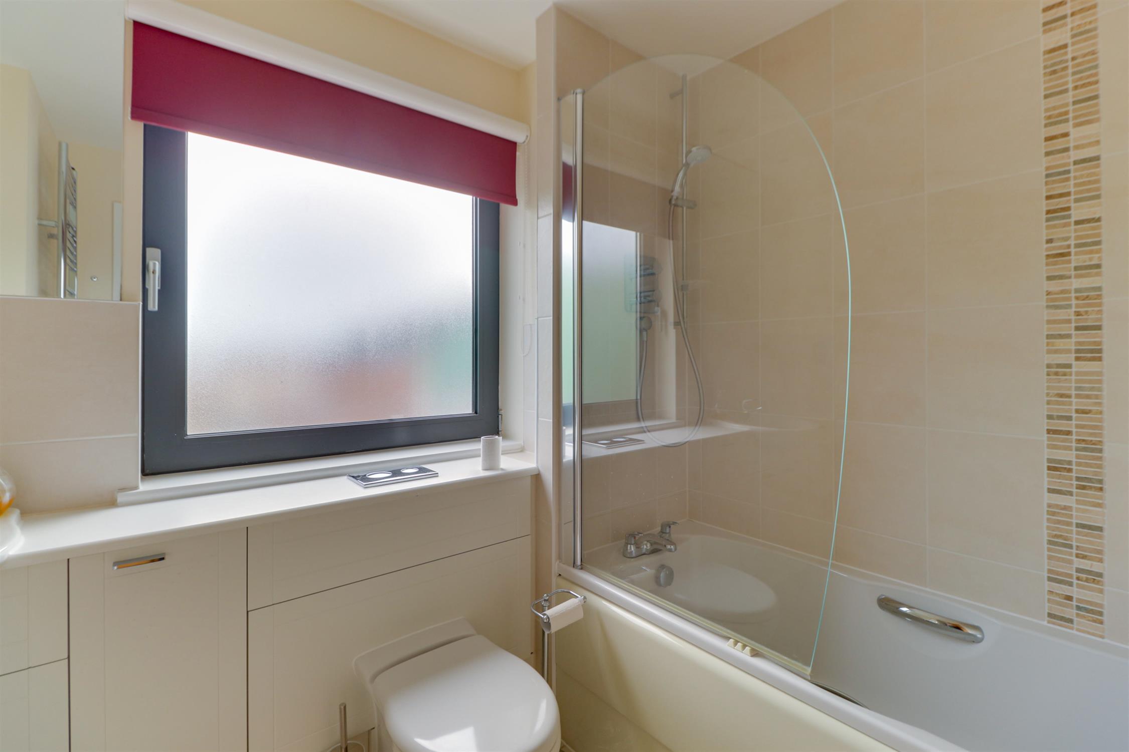 Smooth ceiling, inset spotlights, extractor fan, obscured UPVC double-glazed window, panelled bath with shower over, wash hand basin and toilet set within storage vanity, tiled splash back and tiled flooring.