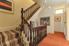 Smooth ceiling, ornate cornicing, radiator, stairs to first floor with carpet runner and stairs rods, understairs storage cupboards, radiator, engineered wood flooring.