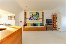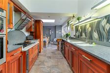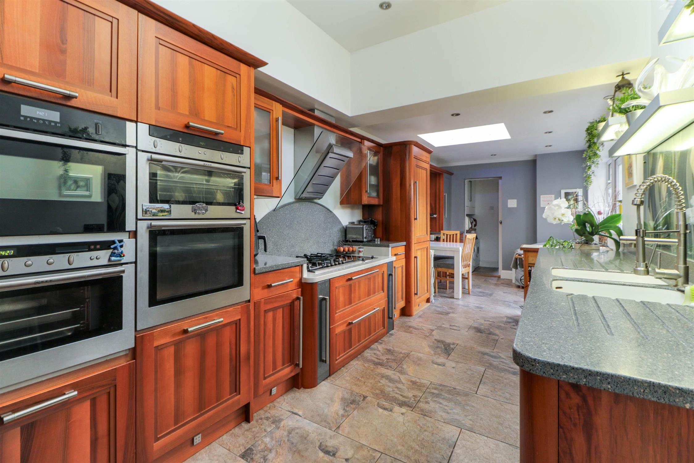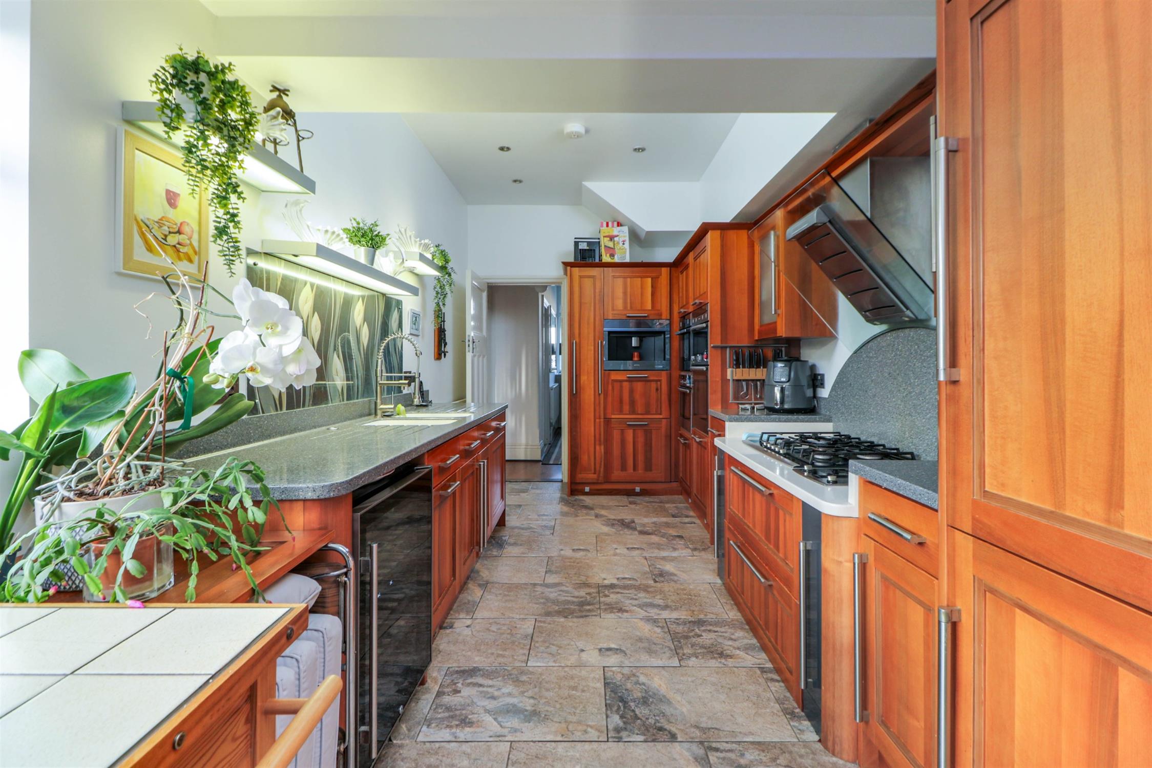 Smooth ceiling, inset spotlights, Velux window, double glazed double doors and side windows to rear garden, kitchen comprising wall and base mounted units with work surfaces over, inset sink and routed drainer with mixer tap over, integrated appliances including 5 ring gas hob, 2 ring electric induction hob, extractor over, high level electric double oven, microwave oven, steamer oven, fridge freezer, wine cooler, and coffee machine, two radiators, tiled floor.