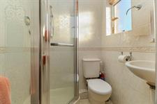 Textured ceiling, double glazed obscured window, shower cubicle, WC, wash hand basin with cupboards beneath, tiled walls, tiled floor.
