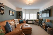 Double glazed bay window to front elevation with plantation style shutters. Radiator. Picture rail. Corner fireplace with open fire and feature fireplace surround.