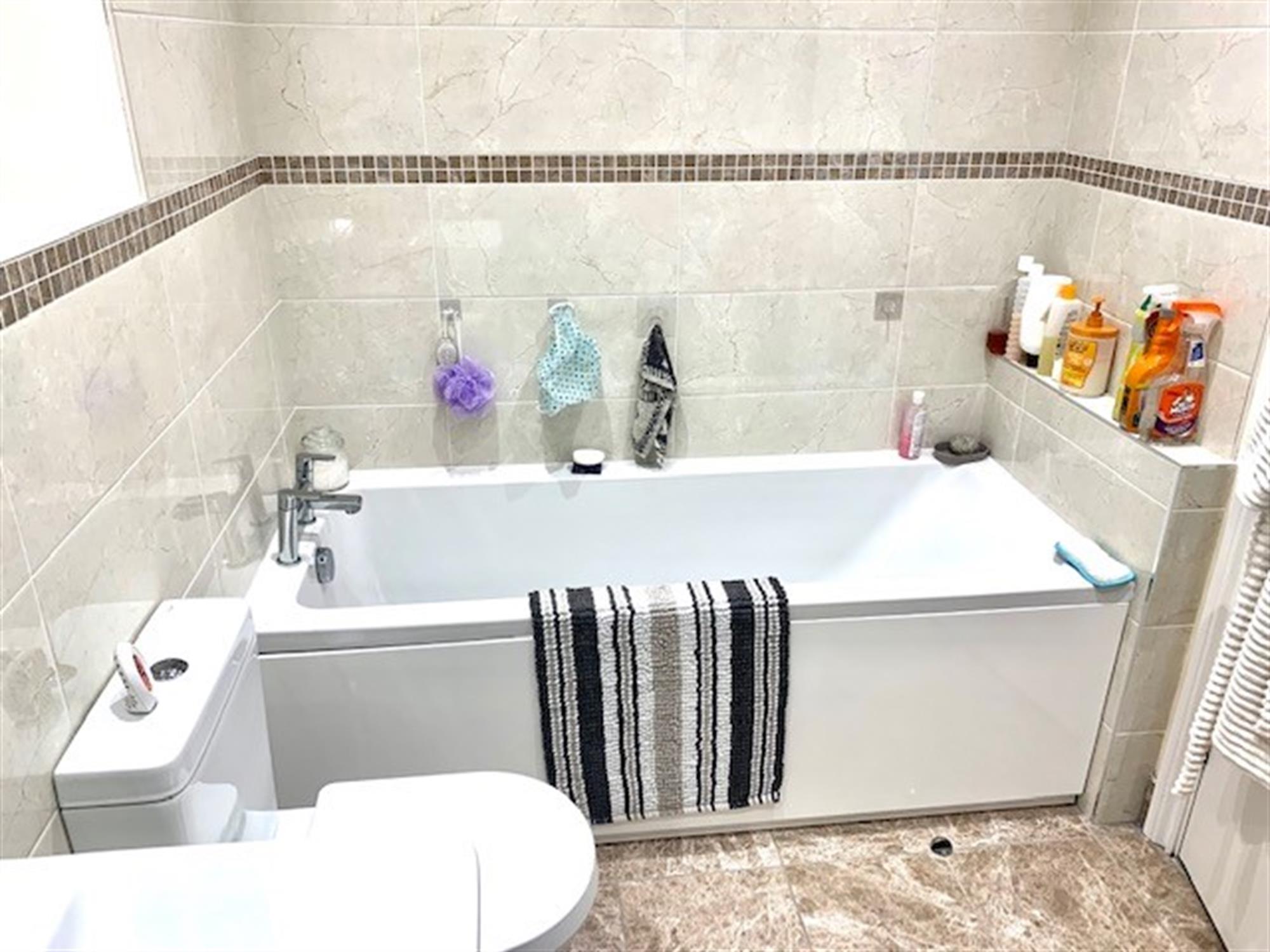 BATHROOM - White suite with bath, shower cubicle, toilet and sink with vanity below.