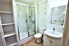 Re-fitted suite comprising: walk in glazed shower enclosure, concealed cistern WC, wash basin with mixer tap and cupboards under, light and shaver point, extractor fan, wall mounted eye level convector heater, fully tiled walls.