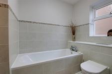 Double glazed window to side elevation. Fitted bath with tiled side panels and mixer taps with shower attachment over. Low level close coupled WC with enclosed cistern. Vanity unit with wash hand basin and storage beneath. Heated chrome towel rail. Extractor fan.