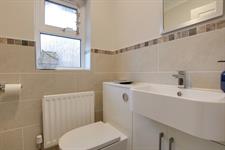 Double glazed window to front elevation. Low level close coupled WC with enclosed cistern. Wash hand basin with storage beneath. Radiator. Part tiled walls. Tiled floor. Radiator.