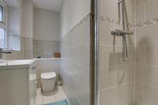 Double glazed window to rear elevation. Tiled shower cubicle. Vanity unit with wash hand basin and storage beneath. Low level close coupled WC. Tiled floor. Part tiled walls. Electric shaver point. Extractor fan. Inset ceiling spotlights. Heated chrome towel rail.