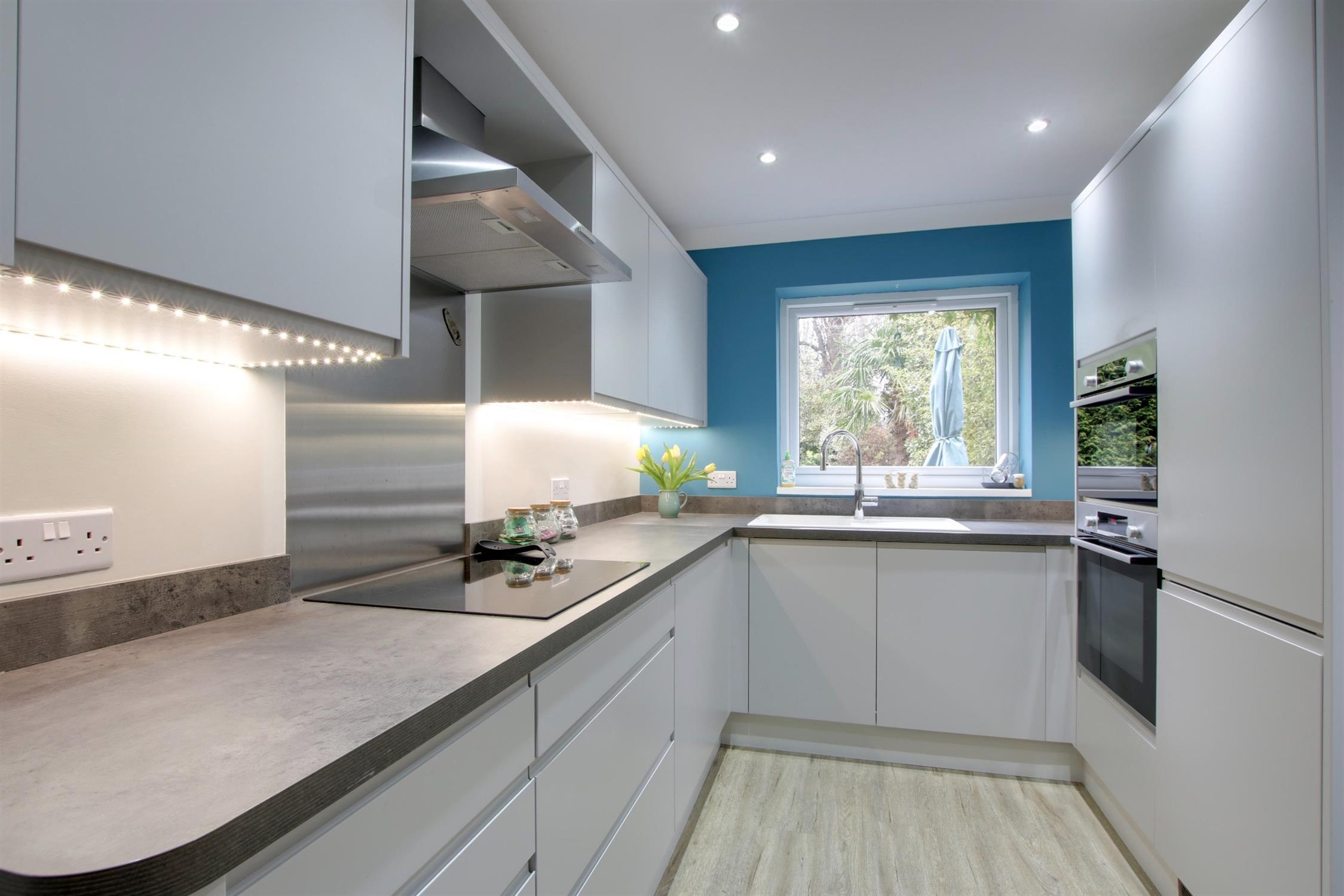 Double glazed window to rear elevation and double glazed door to outside. Refitted kitchen with white single drainer sink unit with 'Quooker' tap providing boiler, filtered and sparkling water, and cupboard under. Further range of wall and base level units with work surfaces over. Built-in four ring induction hob with stainless steel splash back and cooker hood over and pan drawers beneath. Built-in 'Bosch' microwave combination oven with a further fan assisted oven beneath. Built-in and concealed dishwasher and bin store and fridge/freezer and washing machine. Radiator. Inset ceiling spotlights. Under unit lighting.