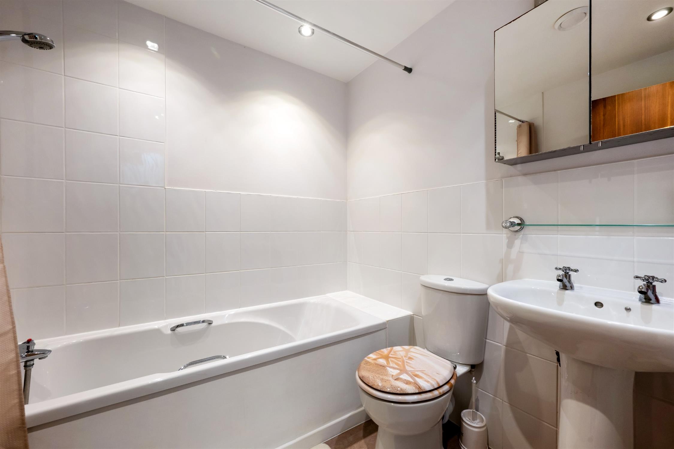 Comprising, panelled bath with mixer tap over and hand-held shower attachment. Pedestal wash hand basin. Low level WC. Tiled floor. Heated towel rail. Part tiled. Inset lighting.