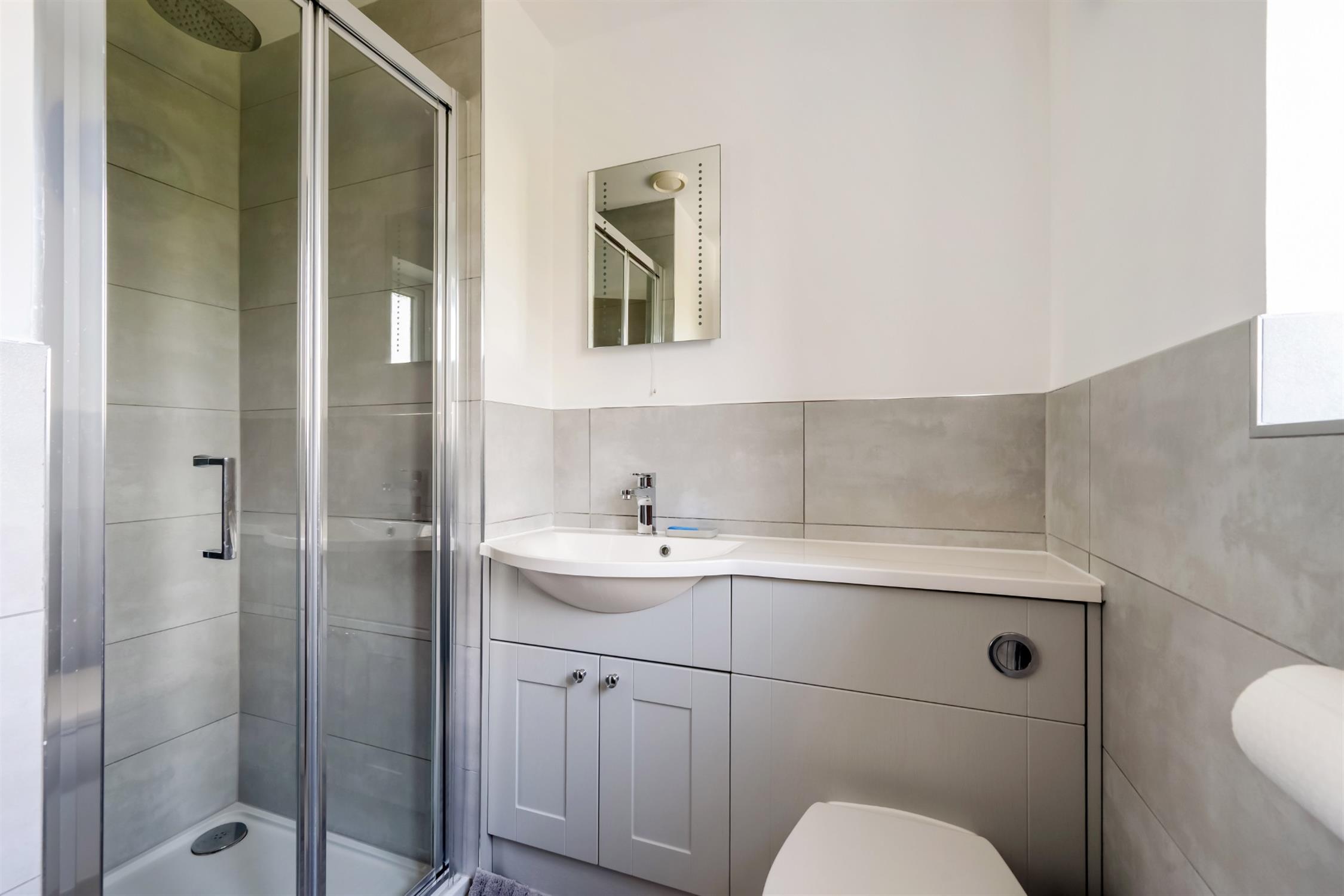 Comprising vanity unit with wash hand basin with mixer tap over and cupboard storage below. Shower cubicle with rainfall shower head and hand-held shower attachment. Closed coupled WC. Vinyl floor. Heated towel rail. Inset lighting. Double glazed window to the front aspect.