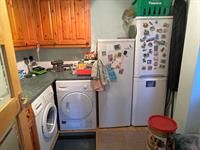Wall and base units with work surface over. Single drainer stainless steel sink unit. Space and plumbing for washing machine and tumble dryer. Door to side.