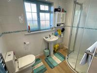 Window to rear. Low level WC. Pedestal wash hand basin. Corner shower with glazed screen. Complementary tiling. Heated towel radiator.