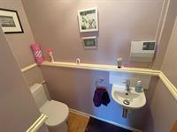 Low level WC. Wall mounted wash hand basin with tiled splashback.