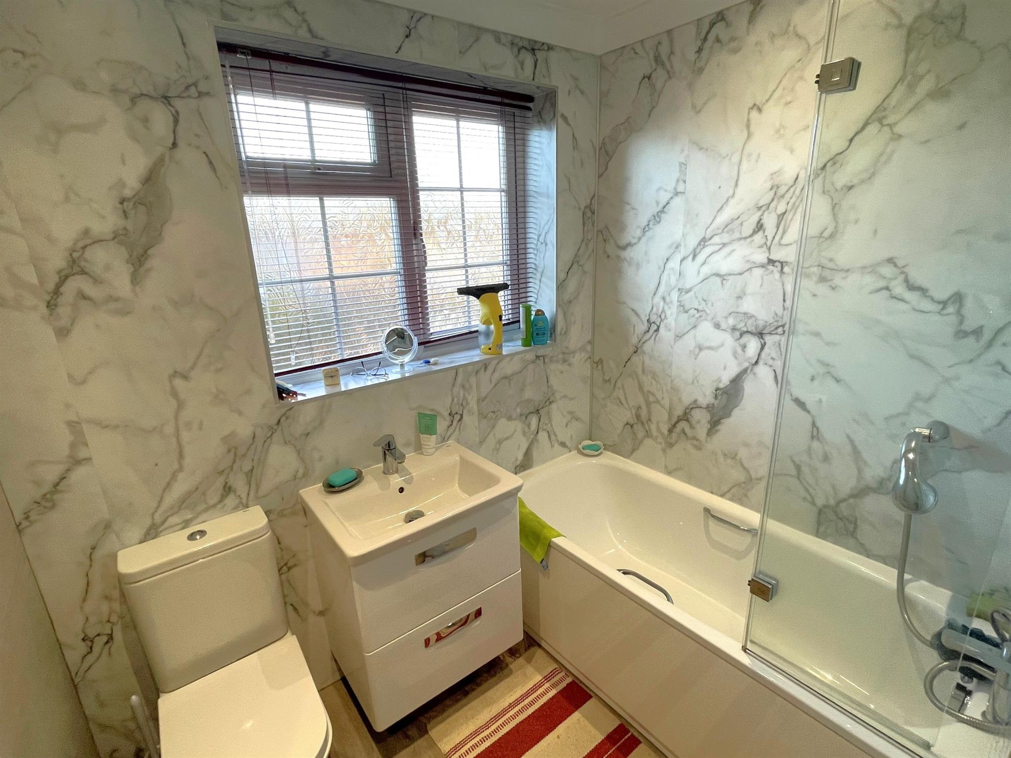 Window to rear. Low level WC. Inset wash hand basin with drawers below. Panelled bath with shower over. Feature tech walling. Heated towel radiator.