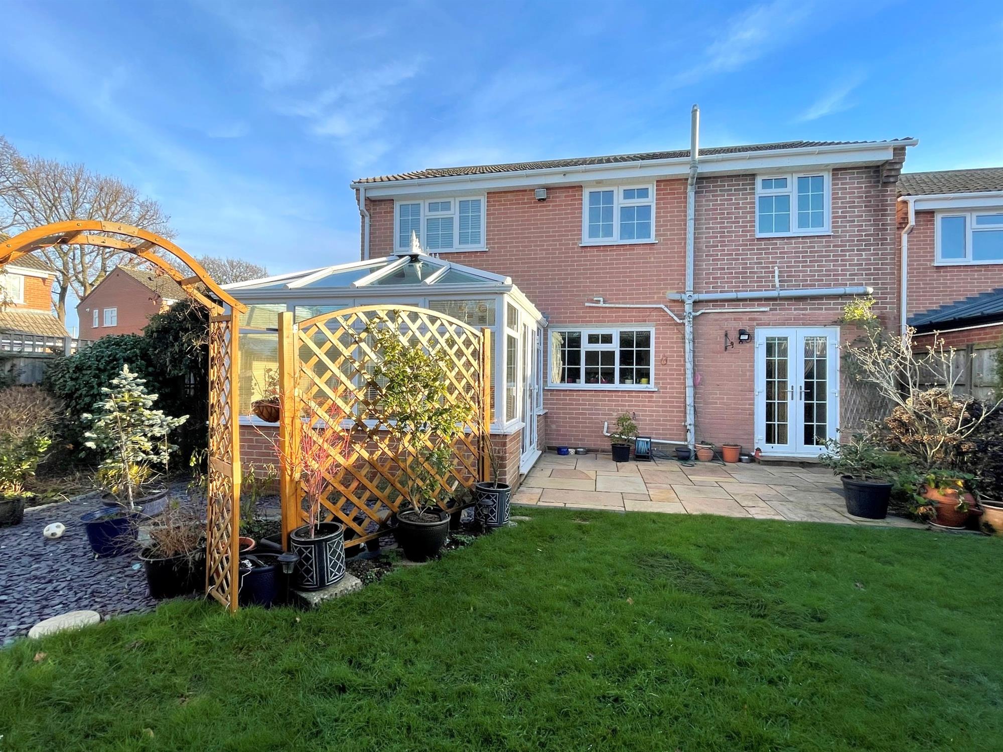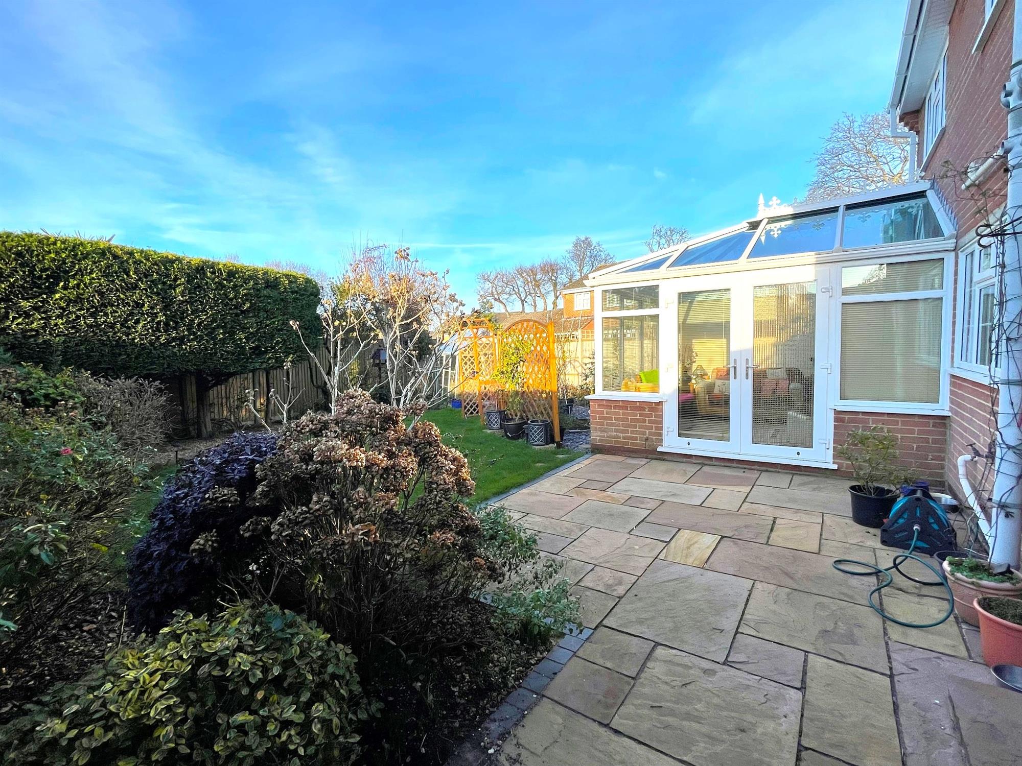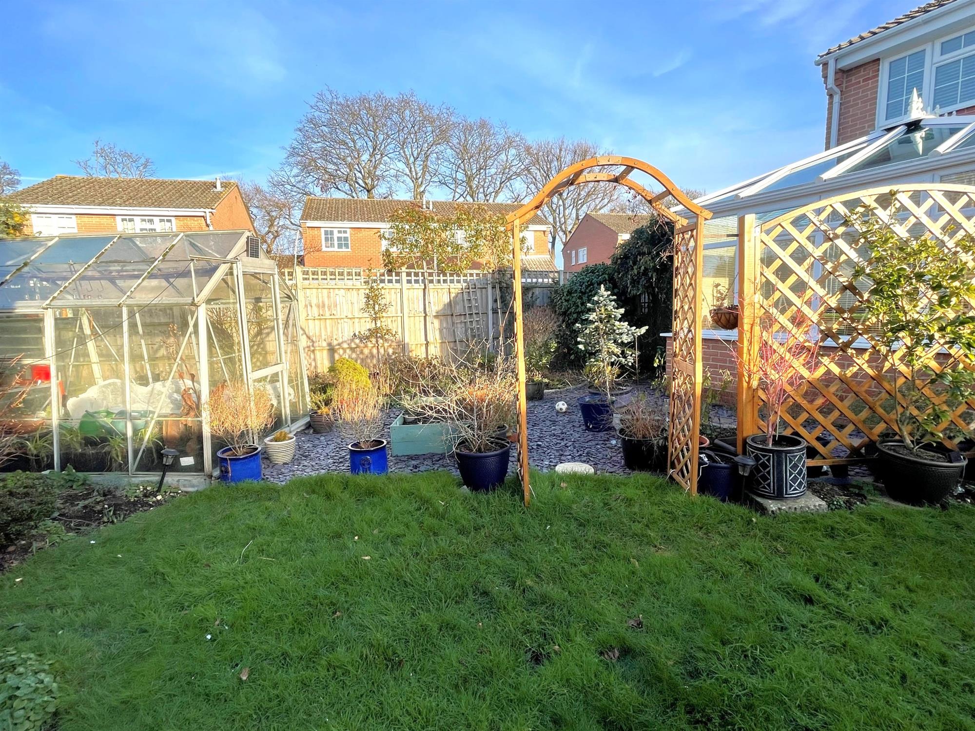Fenced to boundaries. Laid to lawn with shrubs to borders. Patio area. Greenhouse. Outside tap. Pedestrian side access to both sides.