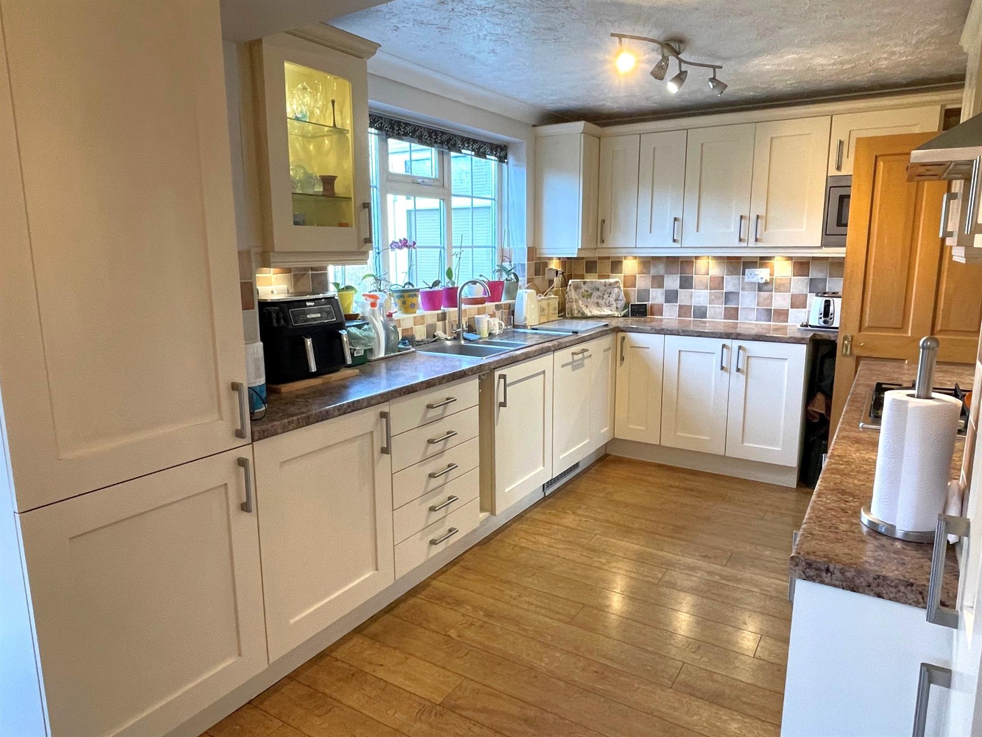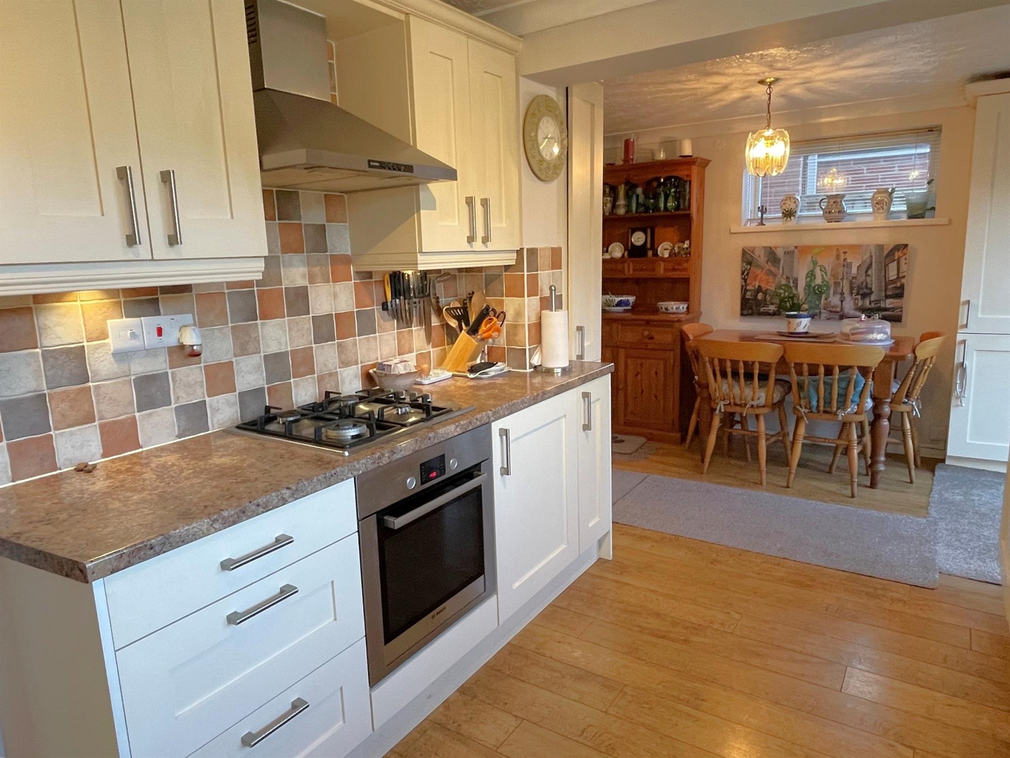 Windows to rear and side. Range of wall ands base units with work surfaces over. One and a half bowl stainless steel sink unit with mixer tap. Tiled splashbacks. 4 ring gas hob with extractor over. Integrated fridge freezer, dishwasher and microwave. Cupboard housing gas boiler. Double doors to garden. Door into:
