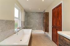 Inset spotlights, two double glazed obscured windows, panelled bath with side taps, walk in shower enclosure, wash hand basin with cupboards beneath, low level WC, tall column radiator, ladder radiator, part tiled walls, vinyl tile floor.