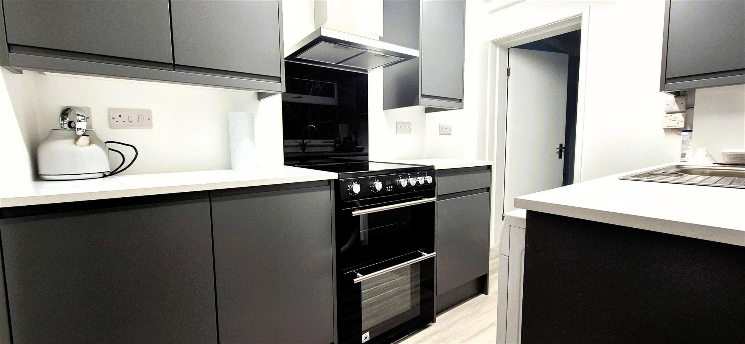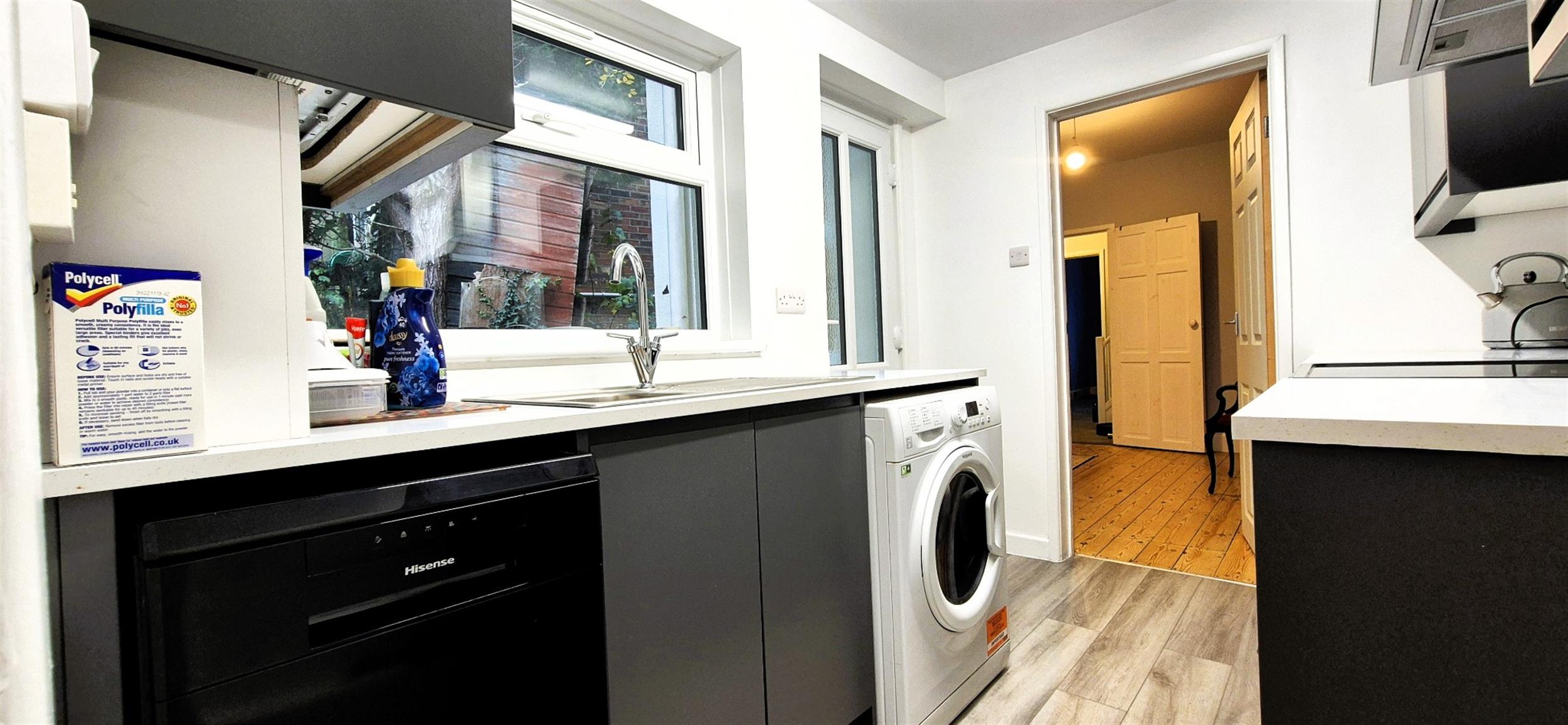 Newly renovated kitchen, ample base unit space with a door and window to the rear garden.