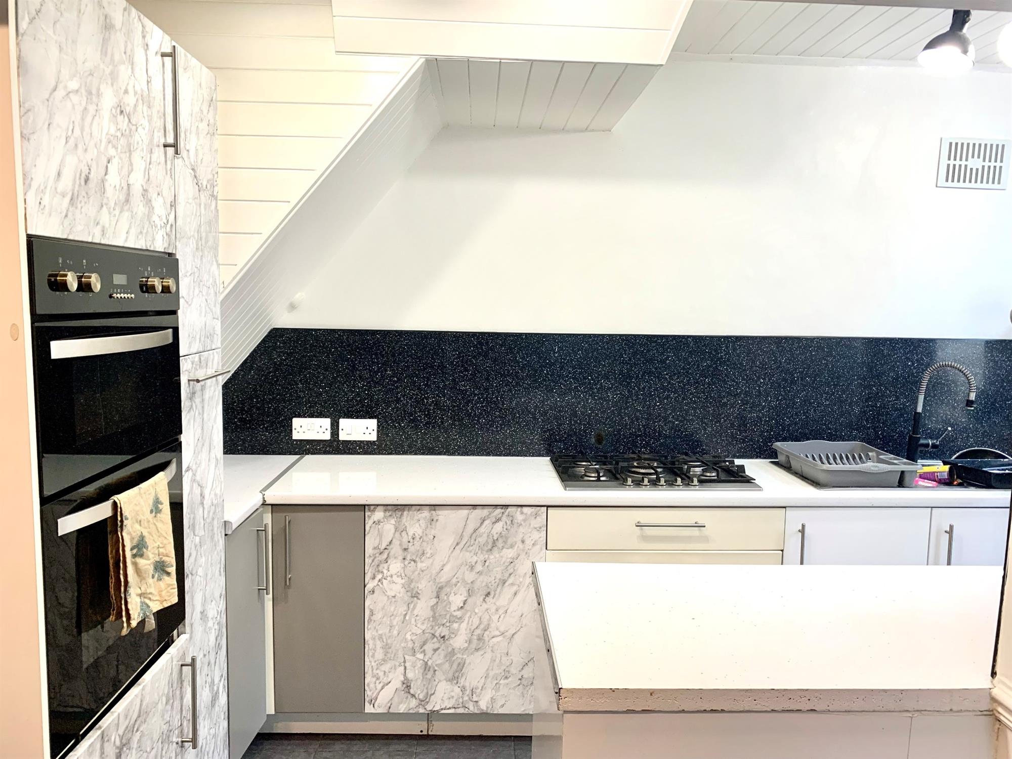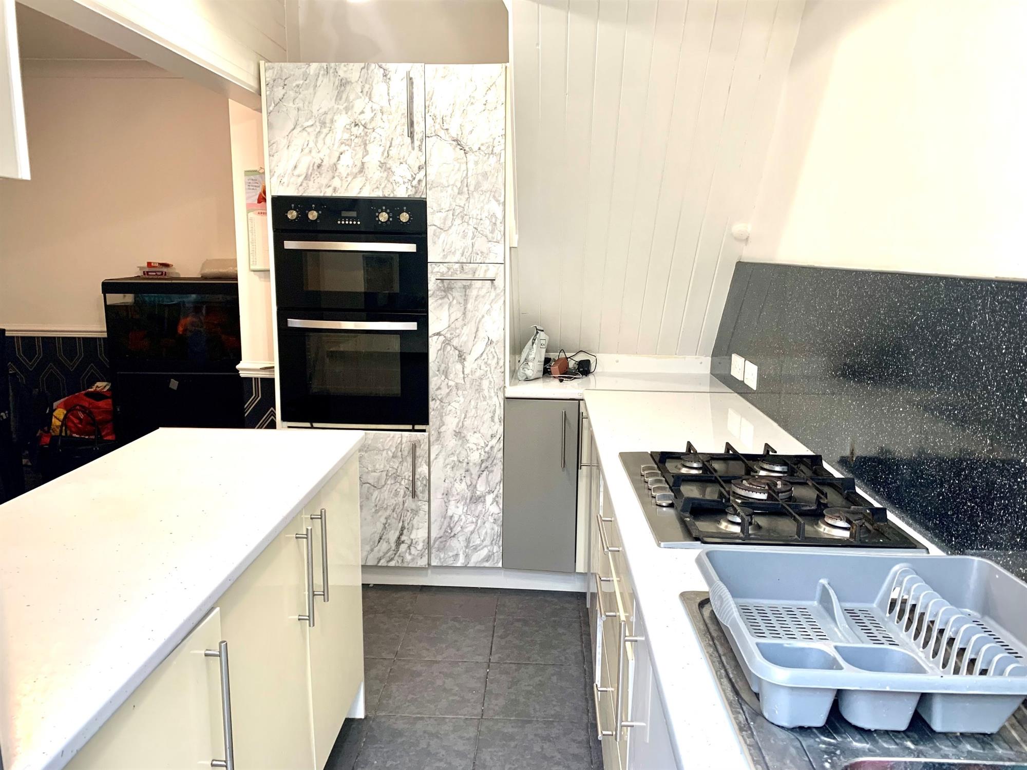 Range of wall and base units with window and door to rear. Appliances consist of: built in double oven, gas hob and integral washing machine. Please note kitchen cupboard doors being replaced prior to occupation.
