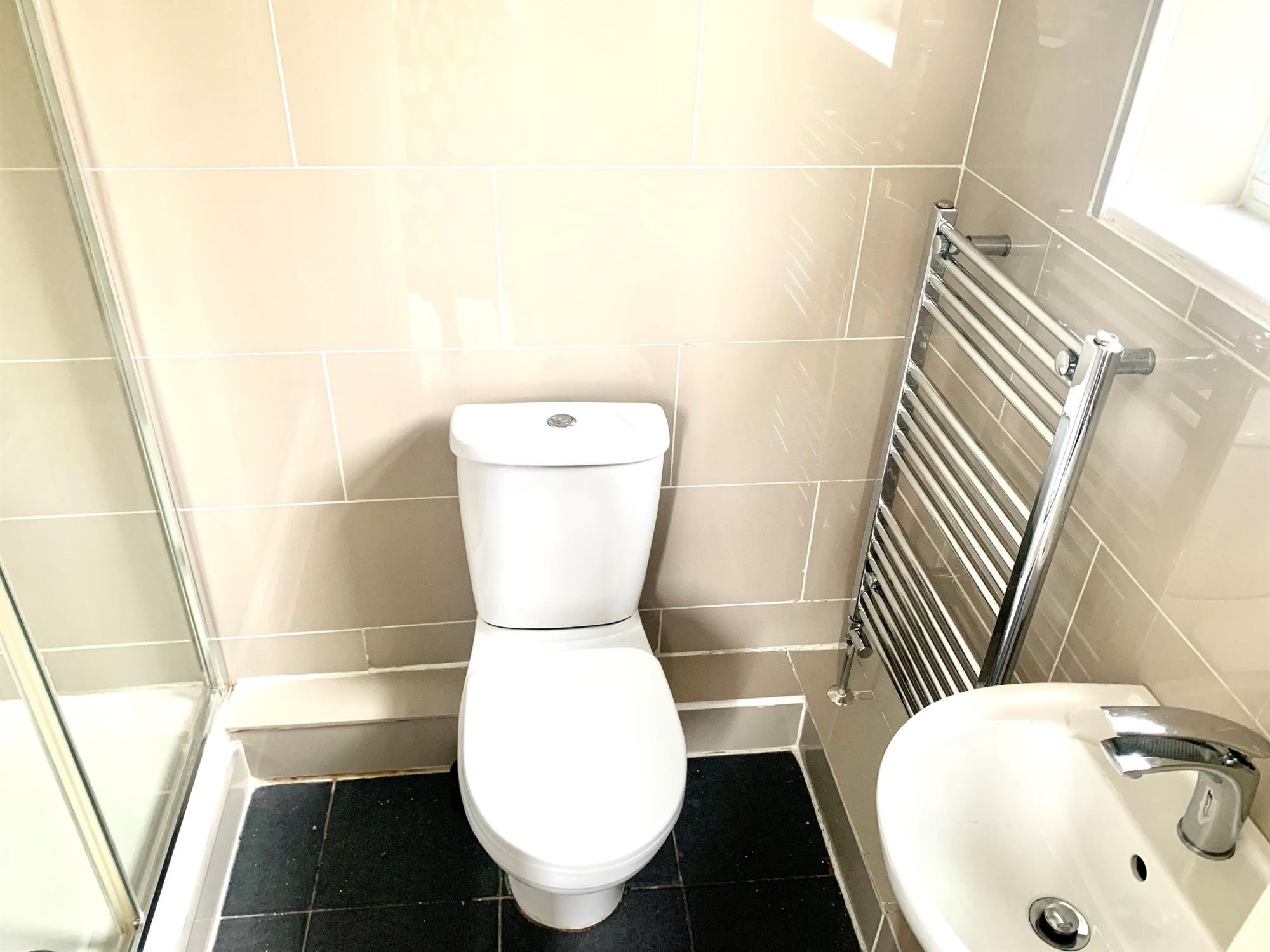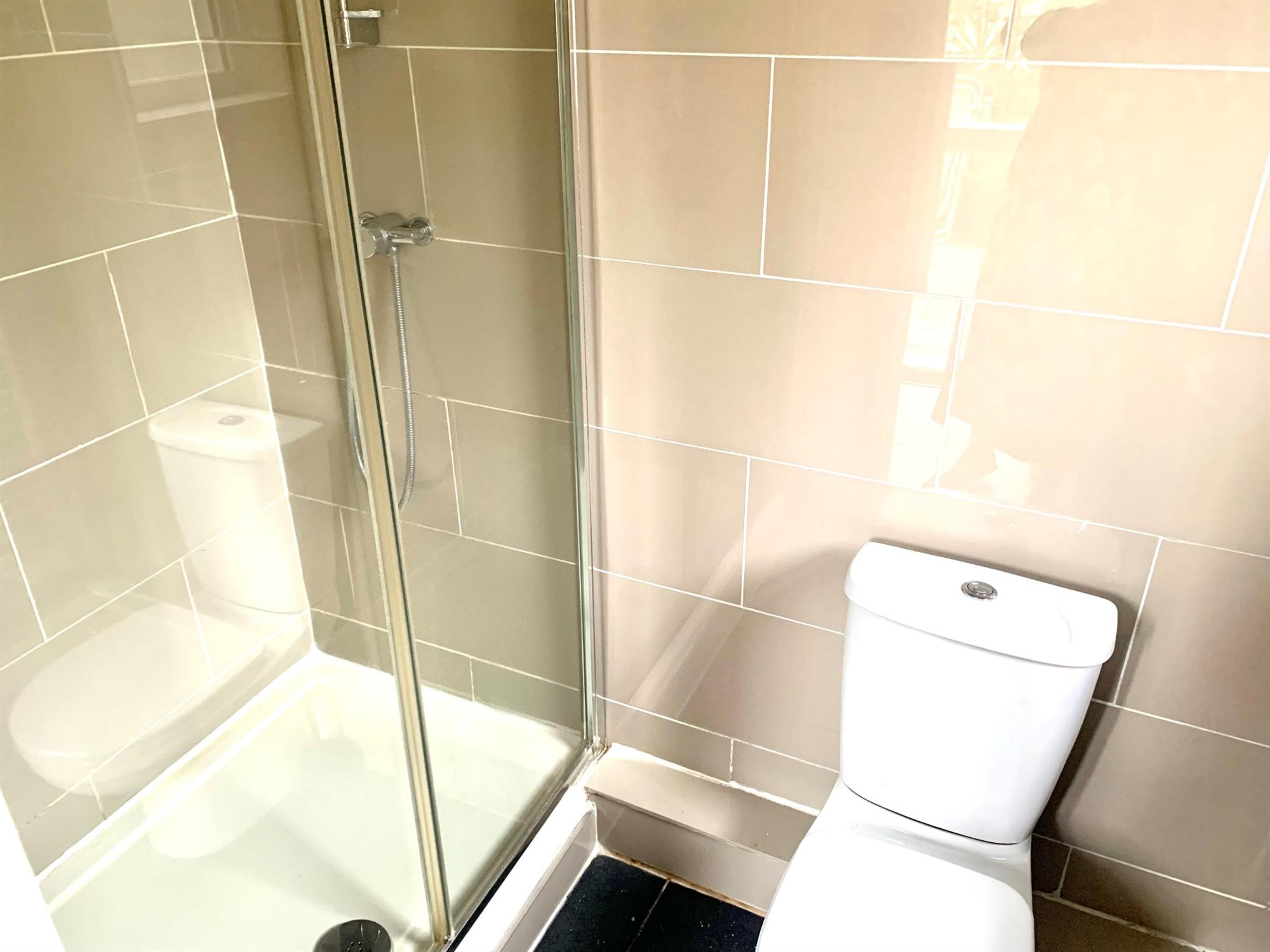 Modern suite consisting of double shower cubicle sink and toilet. Window to rear.