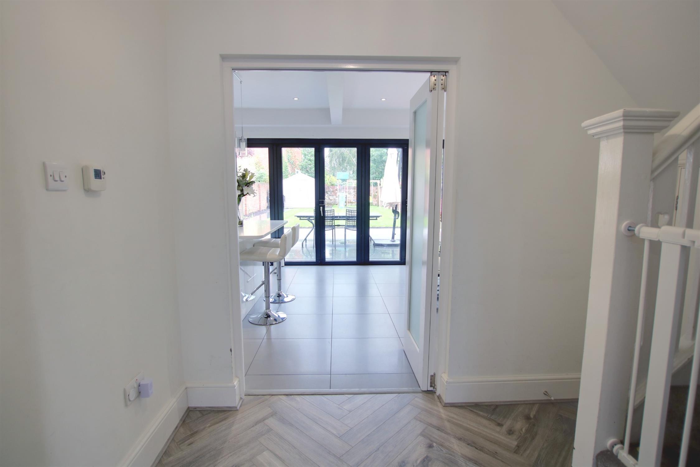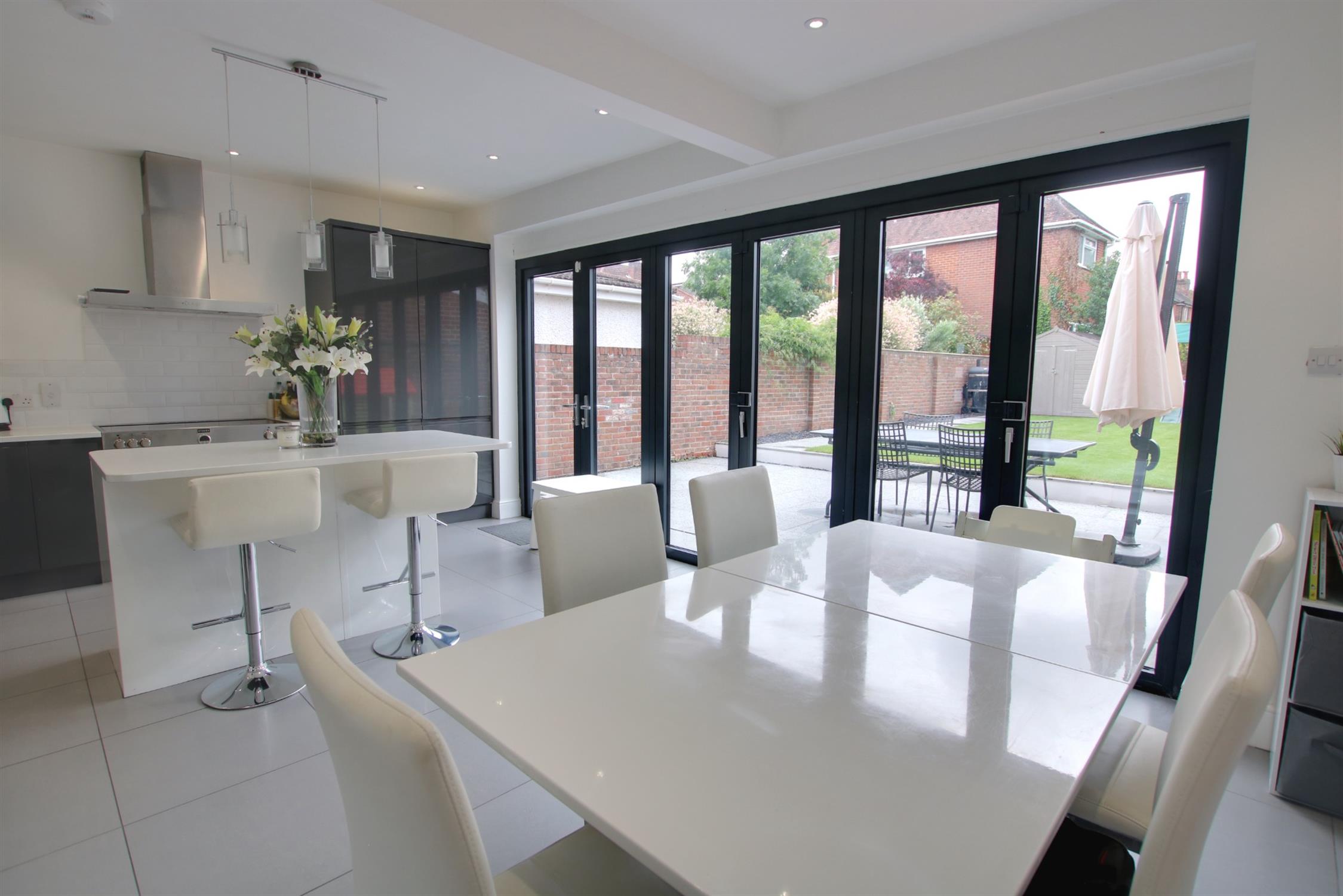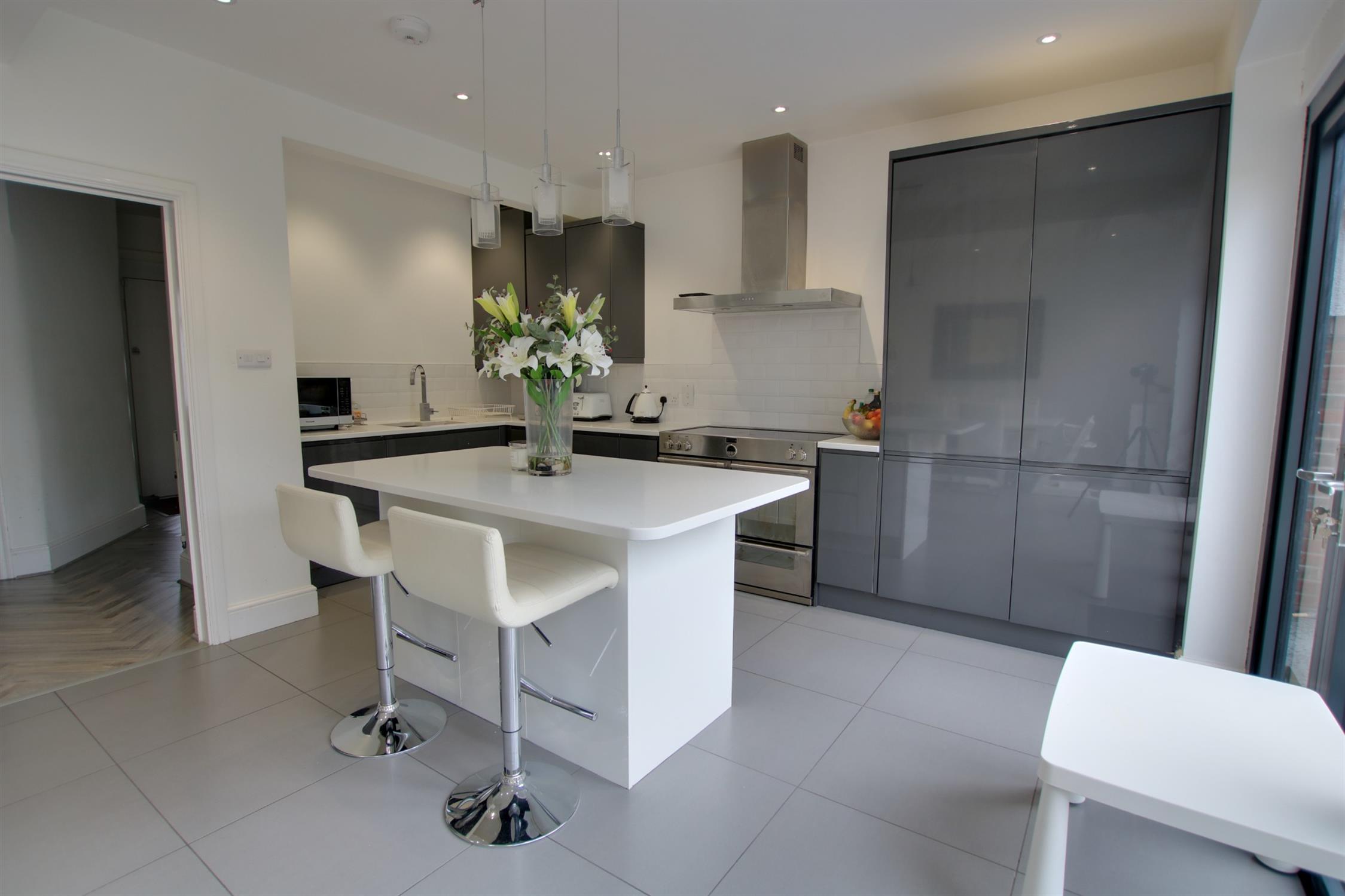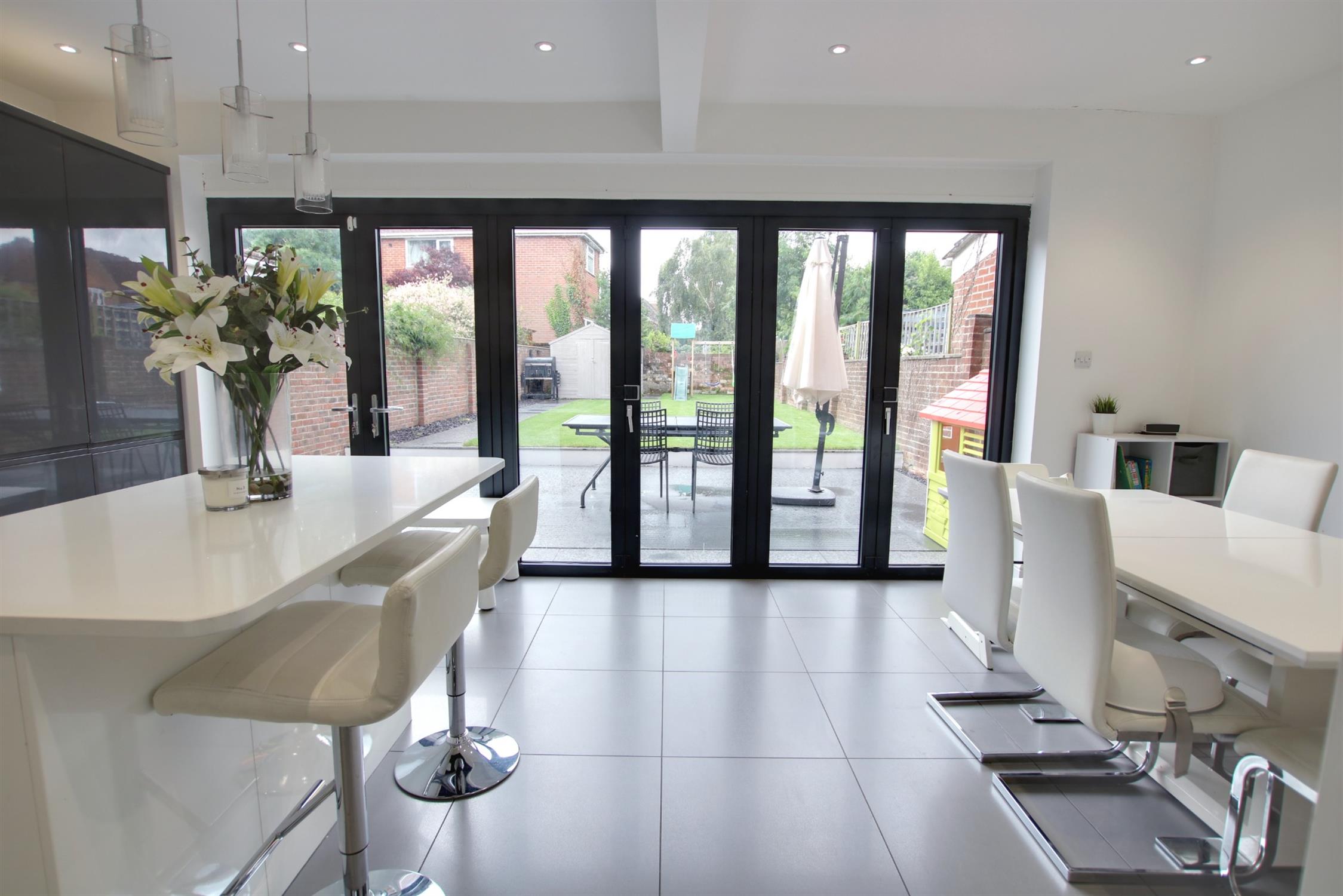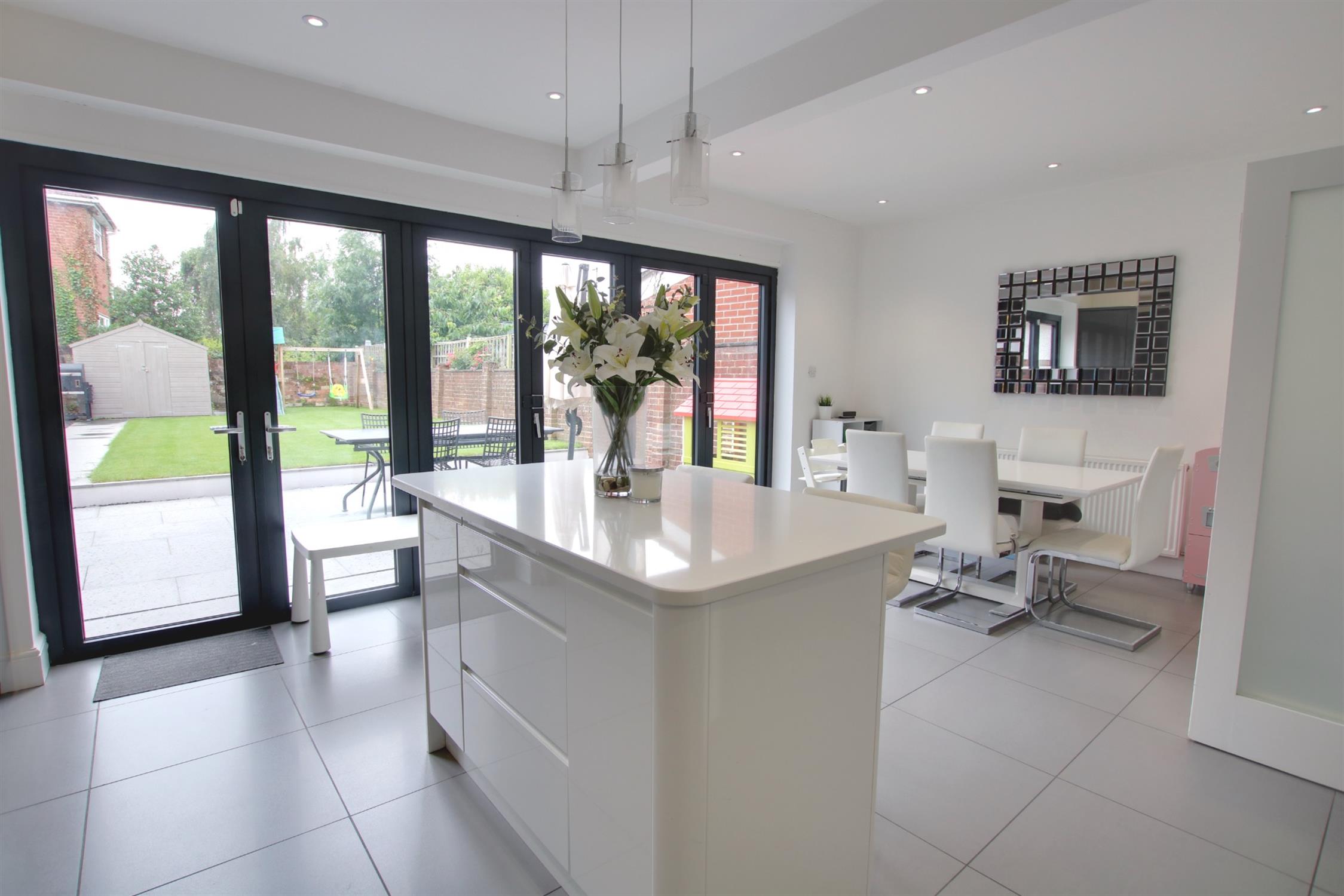 Double glazed bi-fold doors, full width of the room. One and a half bowl sink unit with mixer tap and cupboard under. A range of matching eye level and base mounted units with soft close action and quartz worktop over. Island unit with quartz worktop. Range oven with induction hob and extractor over. Integrated fridge/freezer and dishwasher. Cupboard housing boiler. Tiled flooring.