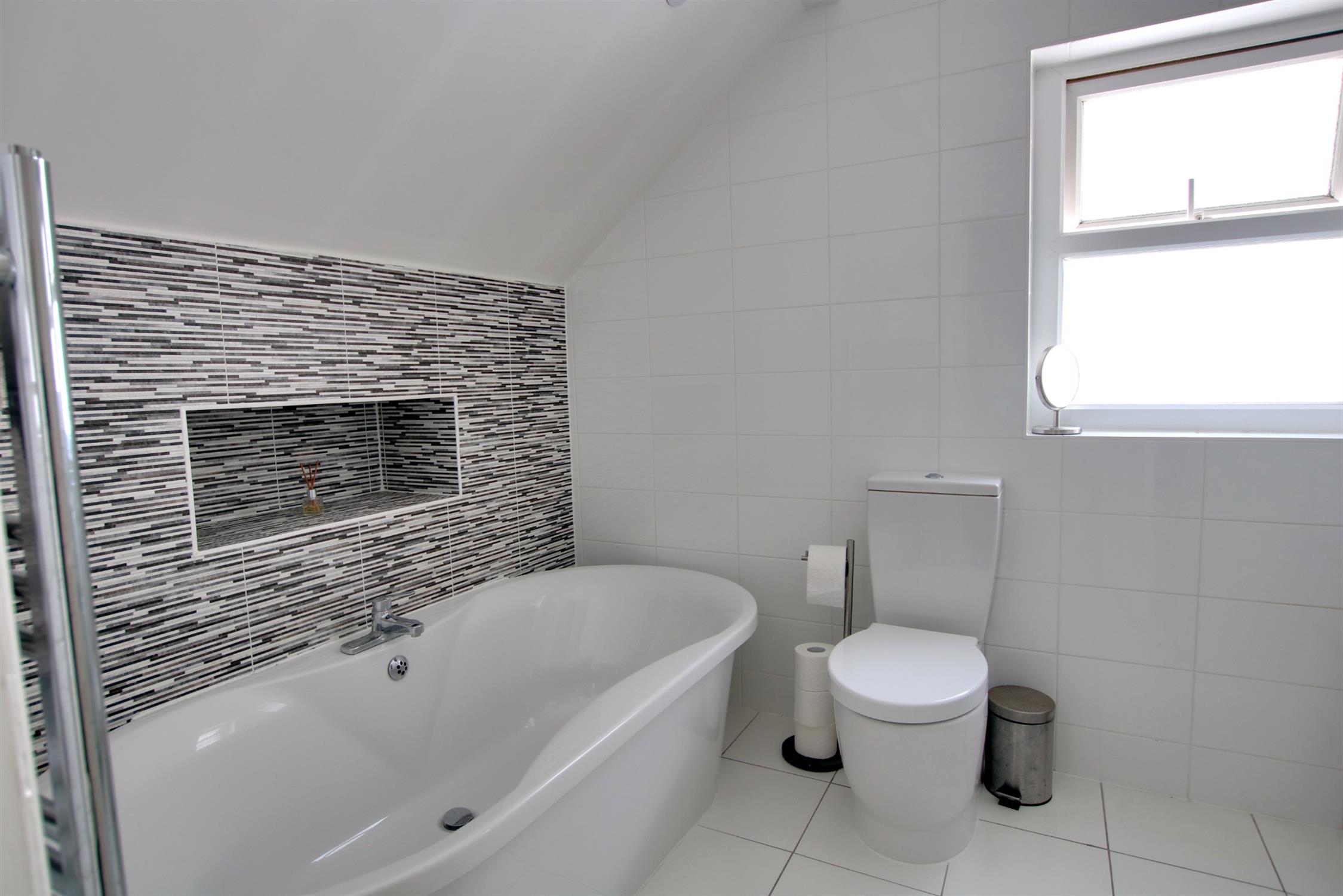 Double glazed obscure glass window to side aspect. Vanity wash basin with mixer tap and cupboard under and low level flush w.c. Heated towel rail. Space and plumbing for washing machine. Space for tumble dryer. Tiled walls. Tiled flooring.