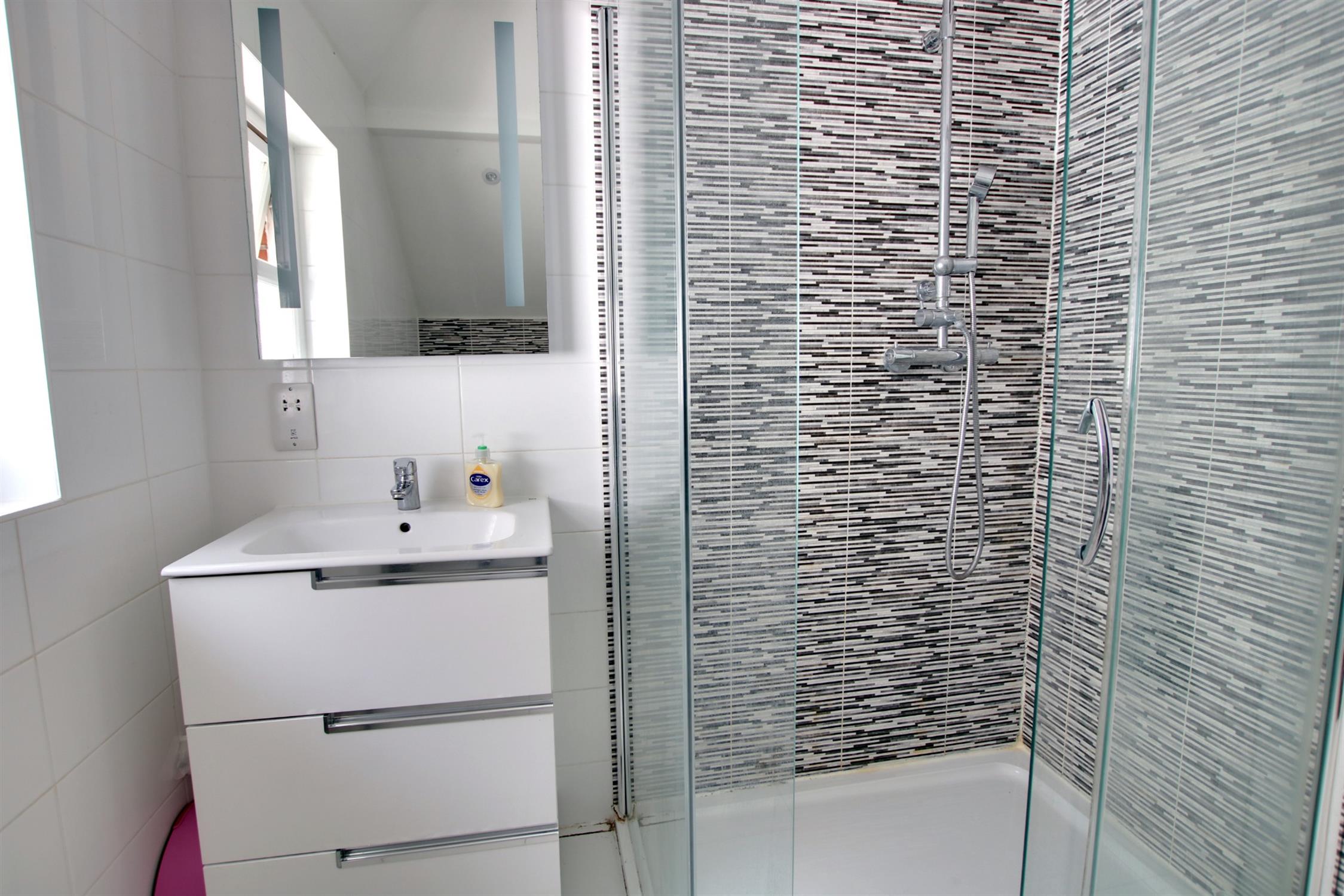 Double glazed obscure glass window to side aspect. Smooth ceiling with recessed lighting. Vanity wash basin with mixer tap and cupboard under, low level flush w.c., tiled double shower cubicle with rainfall shower head and shower attachment and bath with central taps. Heated towel rail. Tiled flooring.