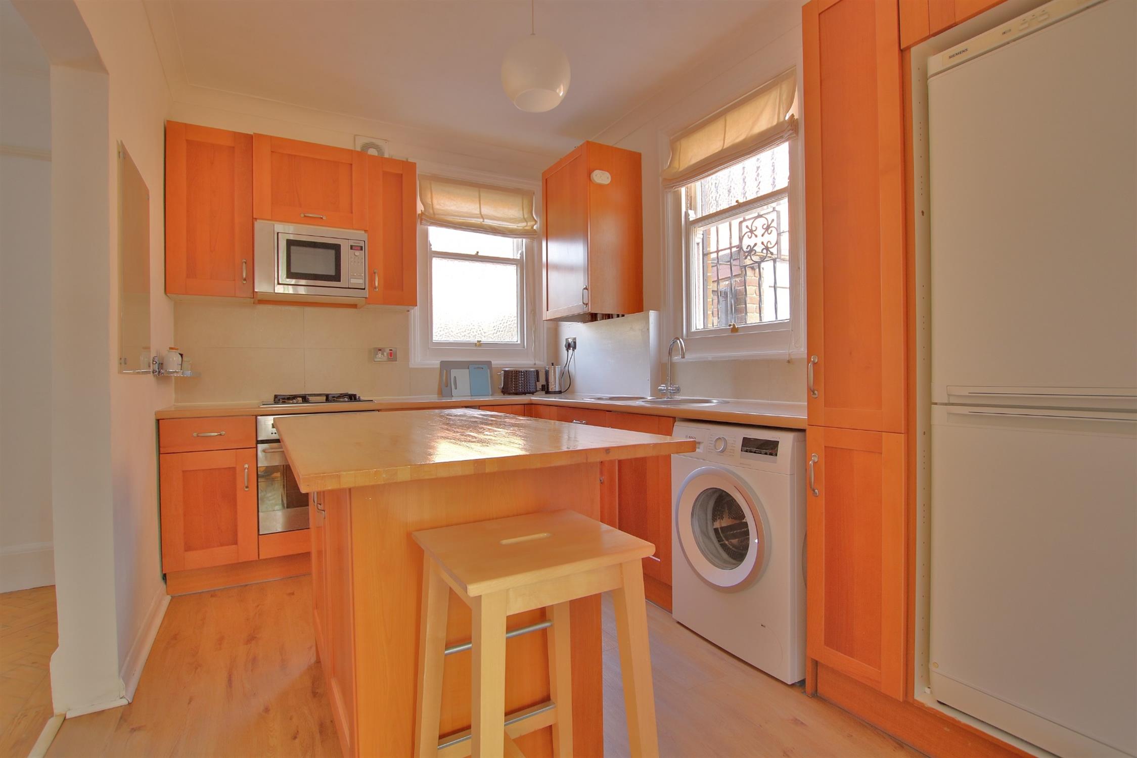 A range of wall and base cupboards with work surfaces over. Four ring gas hob. Stainless steel sink with drainer. Plumbing for washing machine. Space for fridge freezer. Island worktop. Two sash windows.