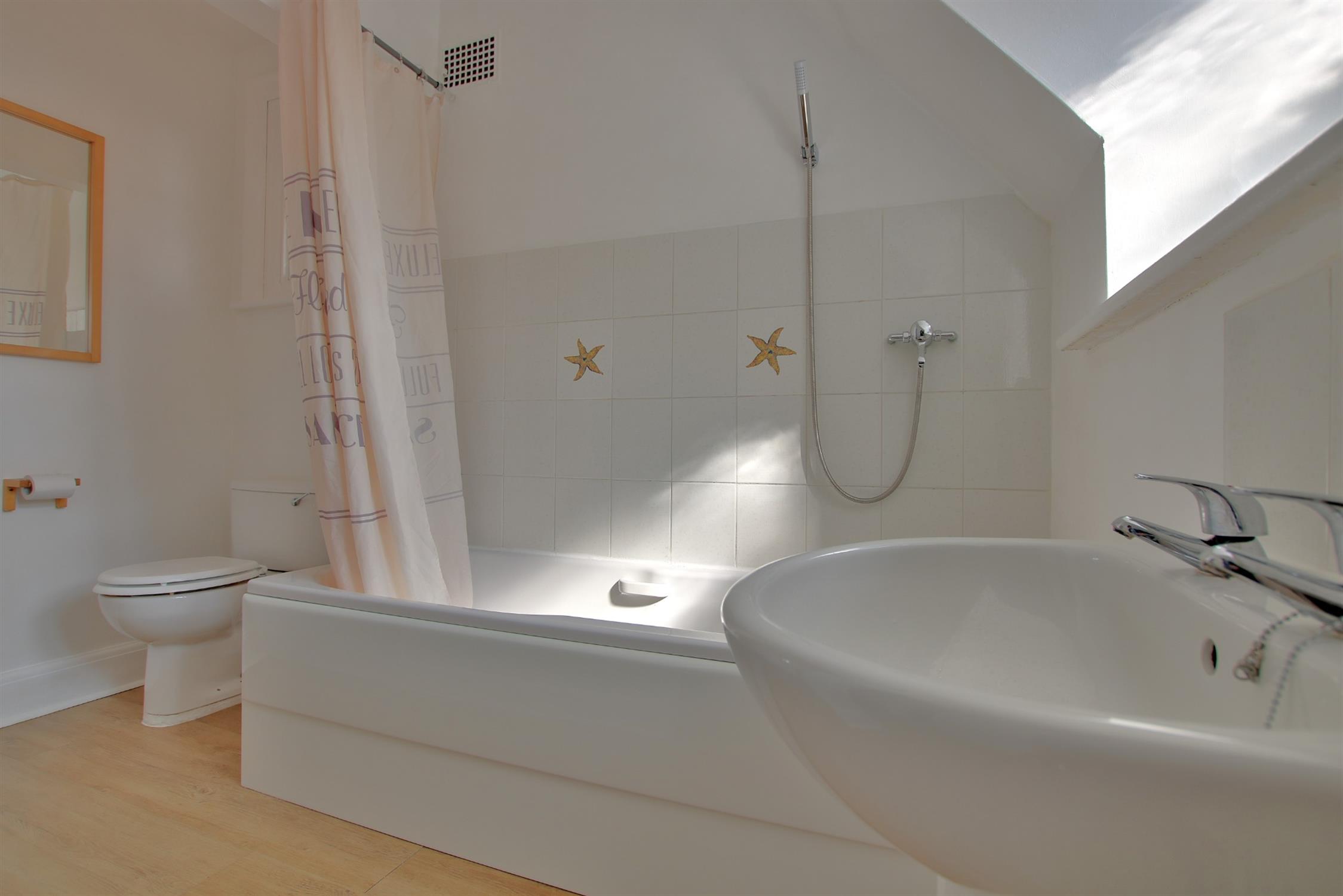 Panelled bath with shower attachment over. WC. Ceramic sink. Radiator. Two frosted windows.
