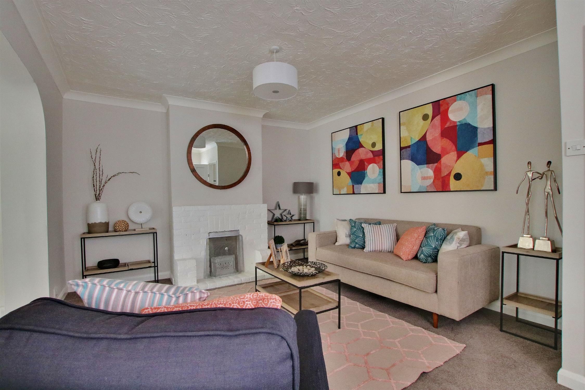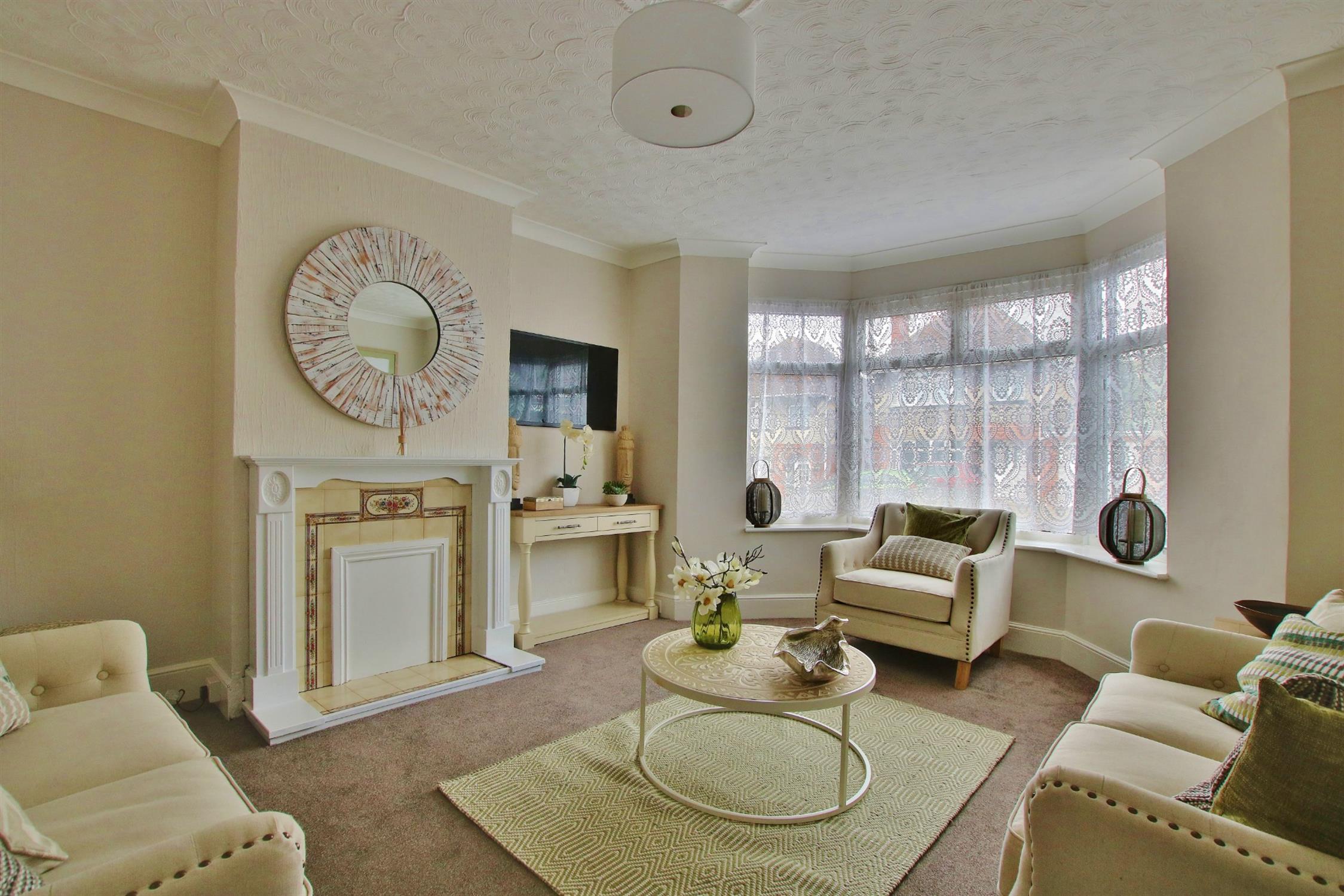Carpeted. Textured ceiling. Double glazed bay window. Feature fireplace. Radiator.