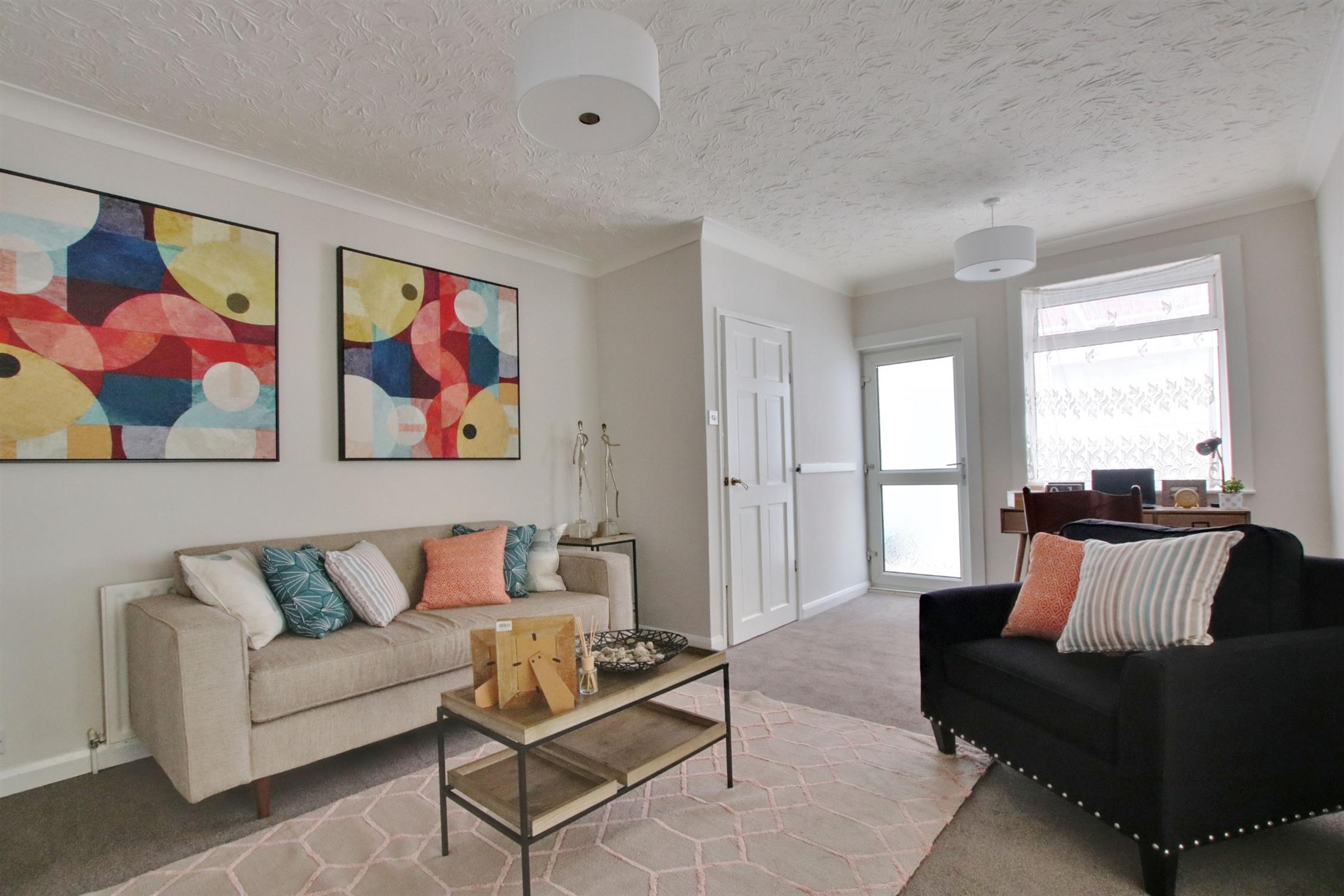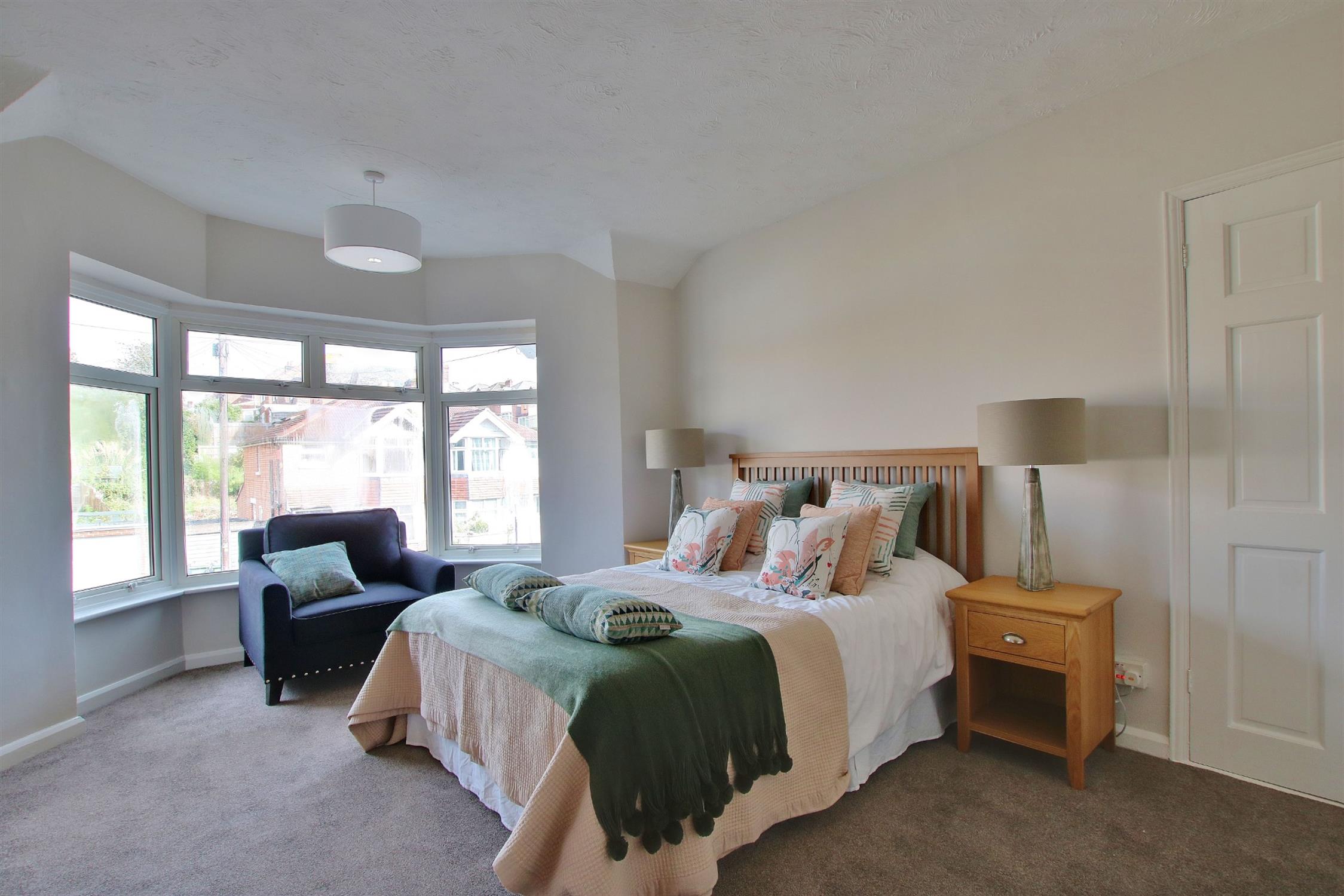 Carpeted. Textured ceiling. Double glazed bay window. Radiator.