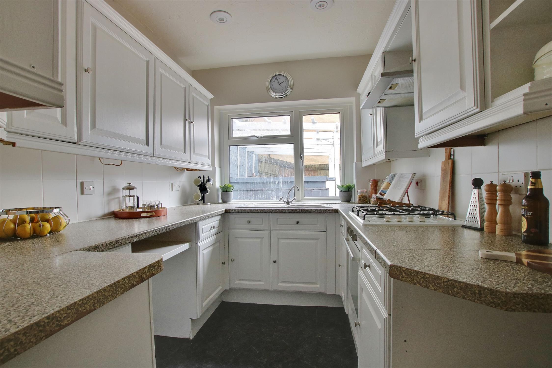 Tiled flooring. Textured ceiling. A range of wall and base cupboards with work surfaces over. Four ring gas hob with electric oven and extractor fan. Sink with drainer. Plumbing for dishwasher.