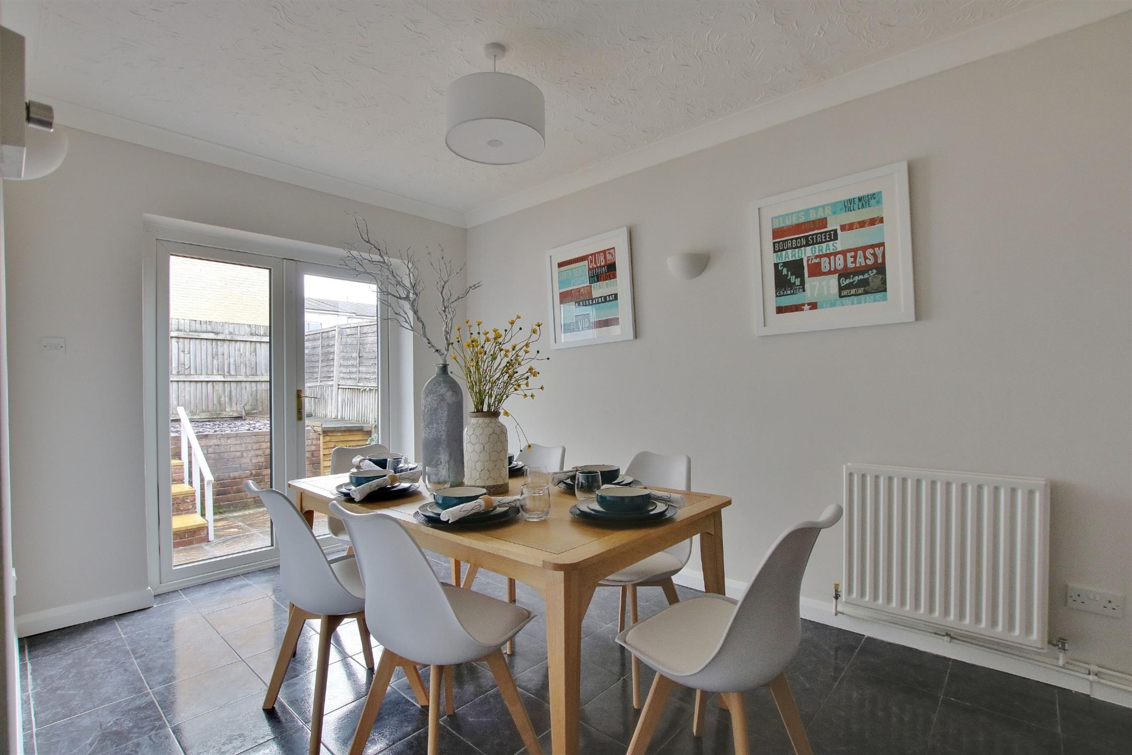 Tiled flooring. Textured ceiling. Radiator. Double doors leading to garden.